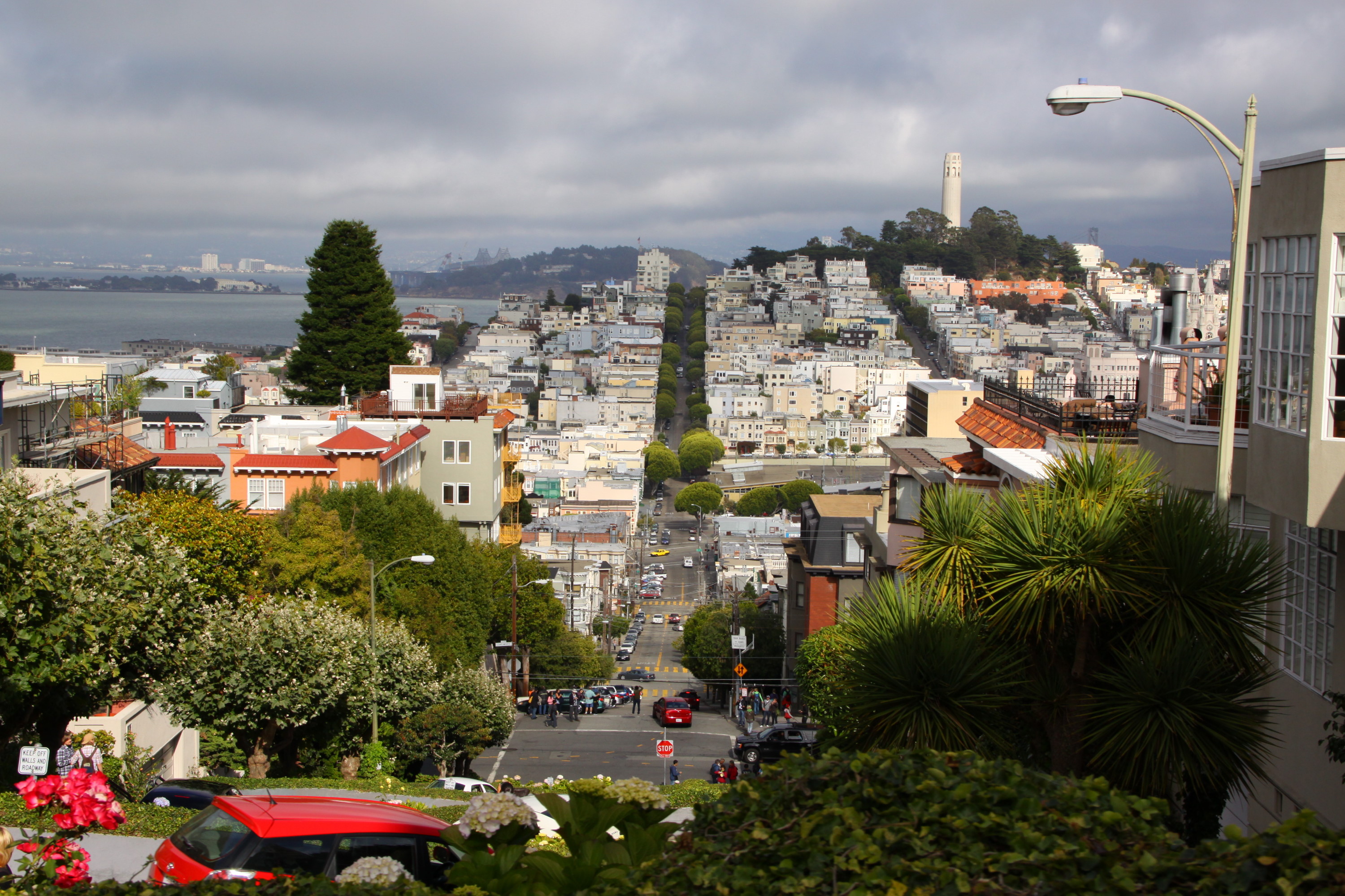 Blick von den Serpentinen der Lombard Street auf Telegraph Hill mit Coit Tower. Im Hintergrund: Treasure Island mit der Oakland Bay Bridge.