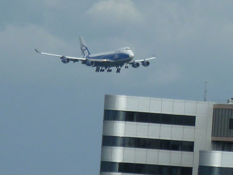 Jumbo im Anflug auf AMS (fotografiert vom Flughafenhotel ca. 1 KM Luftlinie)