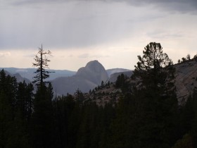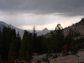 Als wir den idyllisch gelegenen Dog Lake erreichten, machten wir folgerichtig nur kurz Pause (Die Natur rief und ich wollte noch ein paar Fotos machen). Zwanzig Minuten später begaben wir uns auf den Rückweg. Je weiter wir gingen, desto näher schien das Gewitter zu kommen. Das Donnergrollen wurde lauter, noch war aber die Sonne zu sehen. Glücklicherweise ging es nur noch bergab, so dass auch meine Eltern nun wesentlich zügiger voran kamen. Schließlich erreichten wir den Parkplatz und fuhren weiter. Ungefähr fünf Kilometer weiter hielt ich noch einmal an, um ein Foto zu machen. Jetzt waren die dunklen Wolken fast über uns, der Donner wurde immer lauter. Trotzdem war die Landschaft einfach nur atemberaubend schön. Wir schafften es noch bis zum Tenaya Lake, wo ich eigentlich ein Bad nehmen wollte. Hier brach dann der Gewitterguß auf uns herein. Starkregen und Hagel, pechschwarz war es um das Auto herum. Wir nutzen die Pause für einen Imbiss im Auto. Keine 30 Minuten später war der Spuk auch schon vorbei und wir fuhren weiter Richtung Olmstead Point.