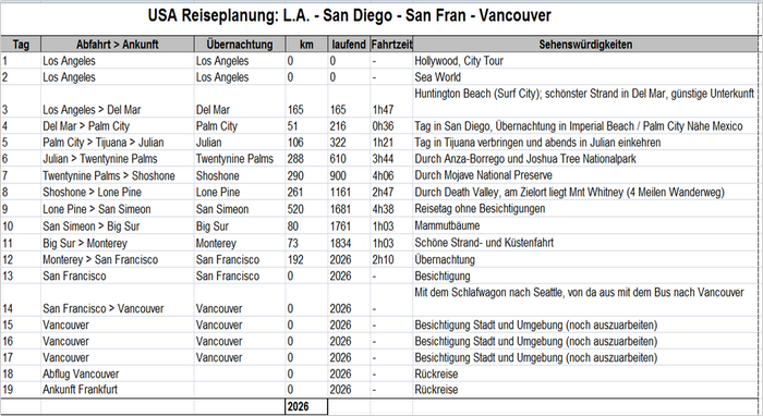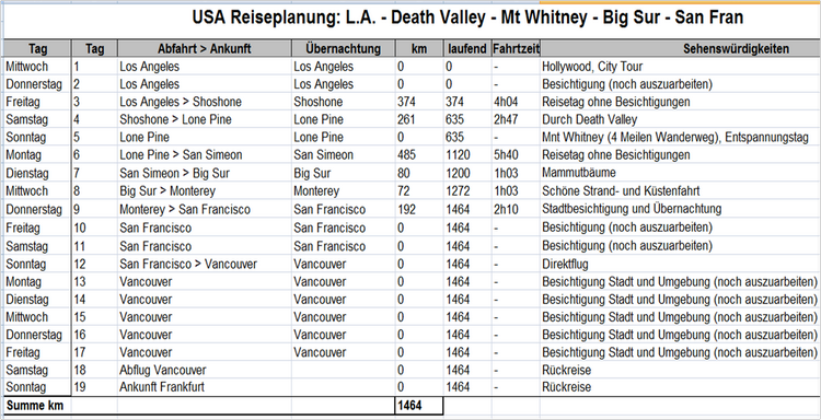 im Juli 2012 planen wir zu zweit mit dem Auto eine Reise durch Kalifornien mit anschließendem Aufenthalt in Vancouver, Kanada. Übernachten möchten wir in Motels oder ähnl, kein Zelten. Wir sind uns bzgl. der geplanten Route und den Fahrtzeiten noch etwas unschlüssig und hoffen darauf, dass Ihr von Euren Erfahrungen berichten und gegebenfalls Tipps zur Routenverbesserung geben könnt. Im Folgenden grob die Route: