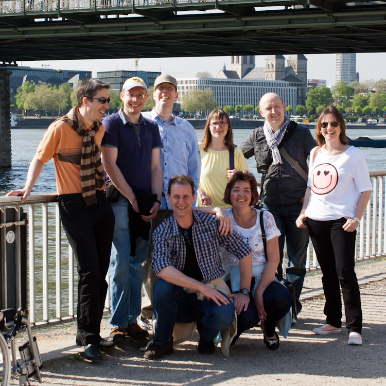 Hier seht Ihr die gut gelaunten Teilnehmer unseres Kölner Treffens am Rheinufer vor der Hohenzollernbrücke.