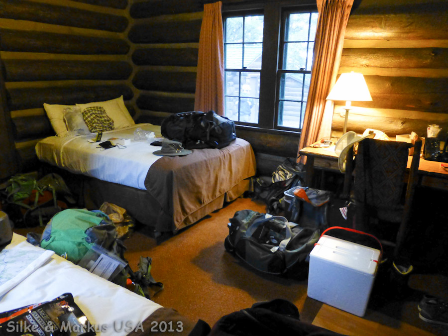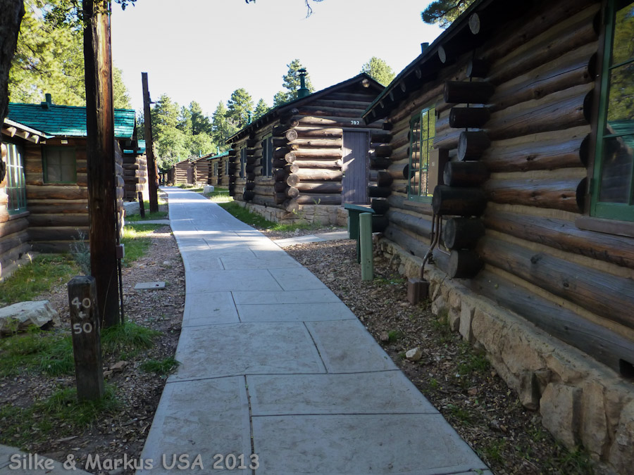 Die Frontier Cabins befinden sich auf der echten Seite vor bzw. neben dem Hauptgebäude. Unsere Cabin 205 war dicht an den 15-min-Parkplätzen, so daß wir Glück mit der Schlepperei hatten. Auf dem Foto ist unsere Cabin ziemlich vollgestellt, weil wir gerade beim packen für Rim to Rim waren.In einer Cabin befinden sich jeweils 2 Zimmer. Nebenan hatten wir einen Schnarcher, so daß an Schlaf ohne Ohrenstöpsel nicht zu denken war. Wer empfindlich ist, sollte eine einzelne Cabin oder ein Motelzimmer buchen. Es gibt auch noch größere Cabins mit Veranda und direkt am Rim, die kosten entsprechend mehr.
