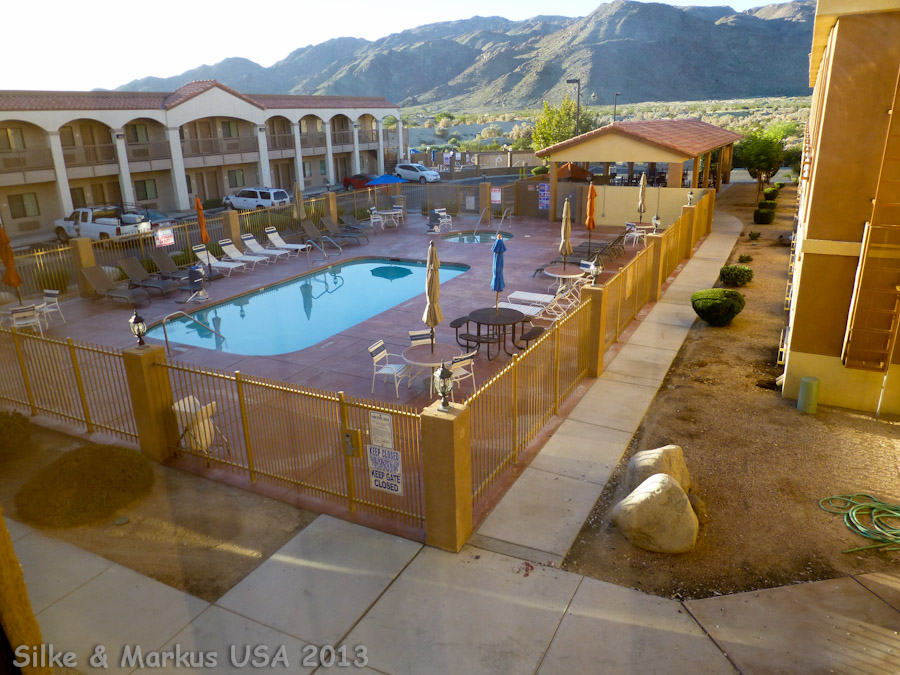 Schönes und relativ neues Hotel in günstiger Lage zu den Eingängen des Joshua Tree NP. Die Zimmer sind sauber, gemütlich und groß. Morgens gibt es Frühstücksbuffet (das übliche: Waffeln, Toast, Kaffee, Cereals, Muffins, Saft,...) im ausreichend großen Frühstücksraum. Die Poolanlage sieht ordentlich aus, leider hatten wir dafür keine Zeit mehr. Nebenan ist gleich ein Supermarkt, in dem man sich ein leckeres Sandwich zum Abendessen oder zum Picknick für den Joshua Tree NP kaufen kann. WLAN funktionierte einwandfrei.