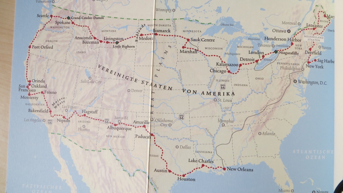 Mein aktuelles Buch hat über 600 Seiten, auf denen der Autor Geert Mak genau 50 Jahre nach John Steinbeck die gleiche Route durch Amerika fährt, siehe Karte. Man erfährt sehr viel aus der Zeit um 1960 aus dem Original-Buch und über die aktuelle Situation. Es gibt viel Politik, Religion, Wirtschaft und Land und Leute. Ich fand es teilweise sehr träge, dann aber auch wieder überaus interessant. Wer also über den Winter mal wieder was neues zum Lesen braucht, der kann hier zuschlagen.