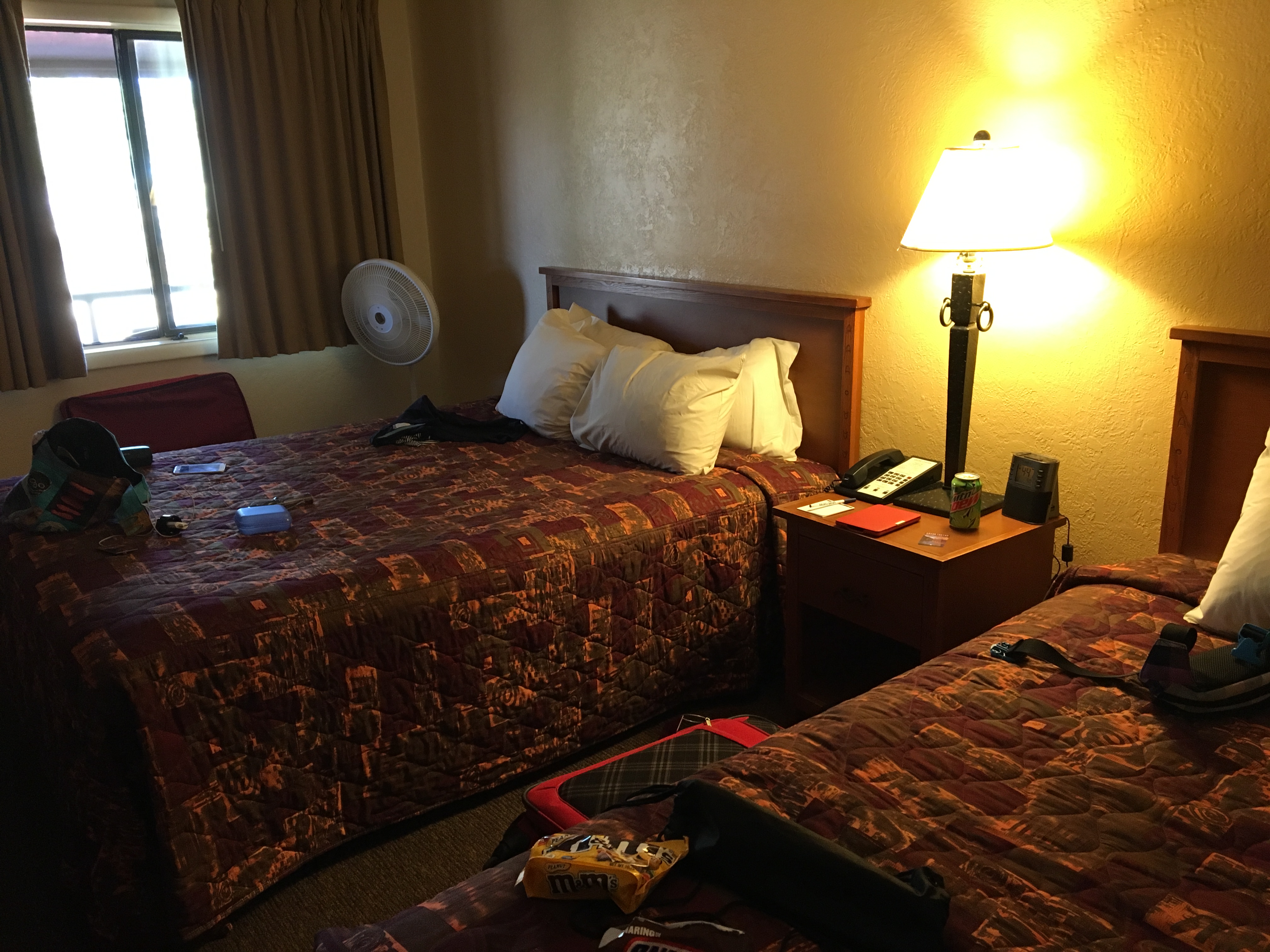 Die Bewertung von 2015 übernehme ich wieder ohne Änderungen. Die Maswik Lodge South ist für uns eine super Basis. 5 Minuten Fußweg zum Rim und die Maswik Cafeteria vor Ort. Die Zimmer sind einfach und etwas altmodisch. Wir wurden gefragt, ob wir während unseres Aufenthaltes auf den Zimmerservice verzichten würden, um Wasser und Strom zu sparen. Wir haben uns dafür entschieden und bekamen als kleines Dankeschön von Xanterra Wasserflaschen geschenkt (s. Foto).