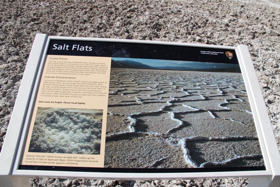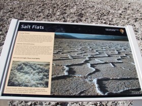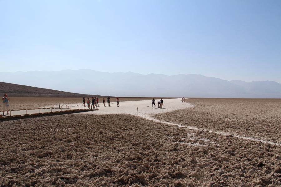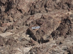 Am Parkplatz angekommen tummeln sich hier schon eine Leute, es ist allerdings nicht so voll wie am Zabriskie Point. Direkt am Parkplatz ragt eine hohe Felswand in den Himmel, auf der der Meeresspiegel mit einem kleinen Hinweisschild markiert ist.