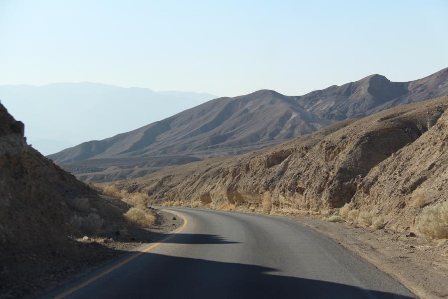 Die gesamte Strecke die wir bis zu Dantes View mühsam hochgefahren sind, müssen wir jetzt wieder zurückfahren. Gut, dass wir schon jetzt oben waren und nicht erst beim Sonnenaufgang morgen. Das wäre schon ein erheblicher Umweg gewesen und jetzt lag es einigermaßen auf dem Weg. Als wir wieder an unsere Ankunftskreuzung gelangen, nehmen wir den anderen Abzweig in Richtung Furnace Creek Ranch.
