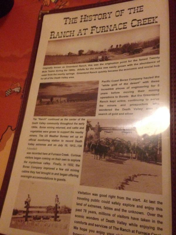 Für die nächsten ca. zwei Stunden verschwinden wir im Rancheigenen Pool, der ziemlich groß ist. Viel ist nicht los, also bekommen wir problemlos noch eine Liege im Schatten. Eine wirkliche Abkühlung ist das aber nicht, denn es handelt sich um einen Quellwasser Pool und der hat muckelige 32°C. Aber immerhin trotzdem eine ganze Ecke kühler als die Lufttemperatur. Irgendwann verschwindet die Sonne hinter den Bergketten, auf die man vom Wasser aus eine tolle Aussicht hat und die Atmosphäre wird echt schön. Der atemberaubende Sternenhimmel hier lässt sich schon jetzt in der Dämmerung erahnen. Wir würden gerne noch was länger faul im Wasser liegen, allerdings müssen wir uns langsam um etwas zu Essen kümmern, bald macht hier alles zu. Es stehen drei Restaurants auf der Furnace Creek Ranch zur Verfügung, wir entscheiden uns für das Forty Niner Café, das soll von den dreien am günstigsten sein. Da man hier nirgendwo sonst etwas herbekommt sind die Preise natürlich überall gesalzen. Atemberaubend ist es nicht, aber auch nicht schlecht.