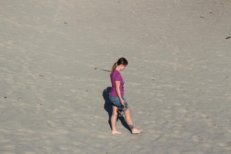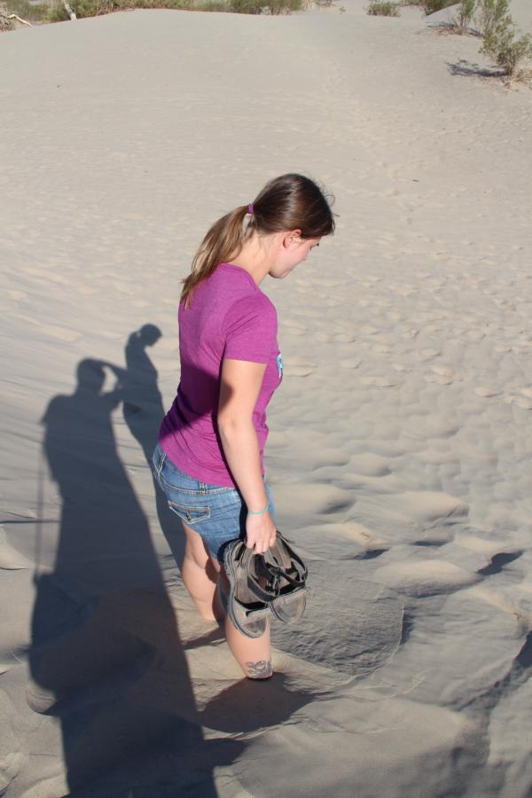 Zuvor habe ich in vielen Reiseberichten den Rat gelesen in der Nähe des Parkplatzes zu bleiben, die großen Dünen zu erreichen ist viel zu weit, besonders bei den Temperaturen. Natürlich machen wir aber mal wieder was wir wollen und laufen los. Es muss ja nicht bis zum Ende sein, aber ein bisschen mehr erleben möchte ich das Ganze schon. Ich ziehe die Schuhe aus, denn so läuft es sich direkt vieeeel besser. Auch Dominik zieht seine Schuhe aus, denn Sand in Turnschuhen ist nicht so schön. Der fängt aber direkt an zu jammern und zu leiden, weil der Sand schon jetzt "unerträglich heiß" wäre... Find ich nicht, eher angenehm. Aber meine Füße sind ja eh sehr schmerzbefreit. Jedenfalls haben wir unseren Spaß in den Dünen und wenn man irgendwo steil runterläuft, dann versinkt man immer so witzig!