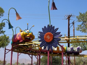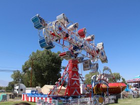 Anscheinend handelt es sich hier um eine jährliche Veranstaltung, bei dem ein Pferderennen und Rodeo (Wie ich das verabscheue! Absolute Tierquälerei!) im Mittelpunkt stehen. Nebenbei gibt es eben noch eine kleine Art Kirmes, für die man aber - anders als hierzulande - Eintritt bezahlen muss. Es handelt sich um eine Ansammlung wirklich alter, wackeliger, rostiger Fahrgeschäfte, die mit unseren modernen Hochglanz Thrill Attraktionen nicht viel gemeinsam haben. Aber egal, ich steh auf so altes Zeug und so sehen wir uns hier in Ruhe um. Allerdings muss ich nochmal zurück zum Auto, denn ich muss dringend meine Cappie holen... Es ist doch noch ganz schön heiß, auch so weit oben.