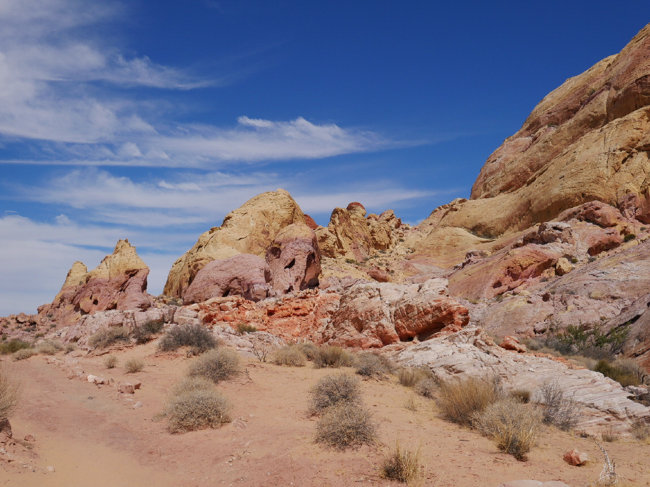 Das Ziel ist der Viewpoint „Rainbow Vista“. Erneut bewegen wir uns zwischen farbigen Steinen zwischen dunklem Rotbraun und hellen, gelblichen Sandfarben, jeder Menge Sand und einigen relativ trockenen Sträuchern. Ansonsten ist die Landschaft nach wie vor wüstenhaft mit einigen Büschen aber ohne viel grün. Aber allein die Felsformationen, die bunten Farben und spannende Wegführung machen die Wanderung schon unterwegs lohnenswert. Als wir am Rainbow Vista ankommen, treffen wir zunächst noch auf ein relativ junges deutsches Pärchen. Die beiden sind gerade fleißig dabei, sich gegenseitig vor dem Ausblick zu fotografieren, sodass wir natürlich gleich anbieten, auch ein Foto von beiden zu machen. Danach verschwinden beide relativ schnell und wir kommen noch mit einem älteren Ehepaar aus Kanada ins Gespräch. Die beiden Rentner sind offenbar auf einer längeren Reise mit dem Wohnmobil unterwegs. Wir warten noch etwas ab, bis auch die beiden gegangen sind und können so die absolute Ruhe in dieser beeindruckenden Landschaft genießen, ein wirklich wunderschöner Moment. Nach einiger Zeit starten wir den Rückweg, der jetzt natürlich relativ schnell und unspektakulär verläuft, da wir die Strecke bereits vom Hinweg kennen.