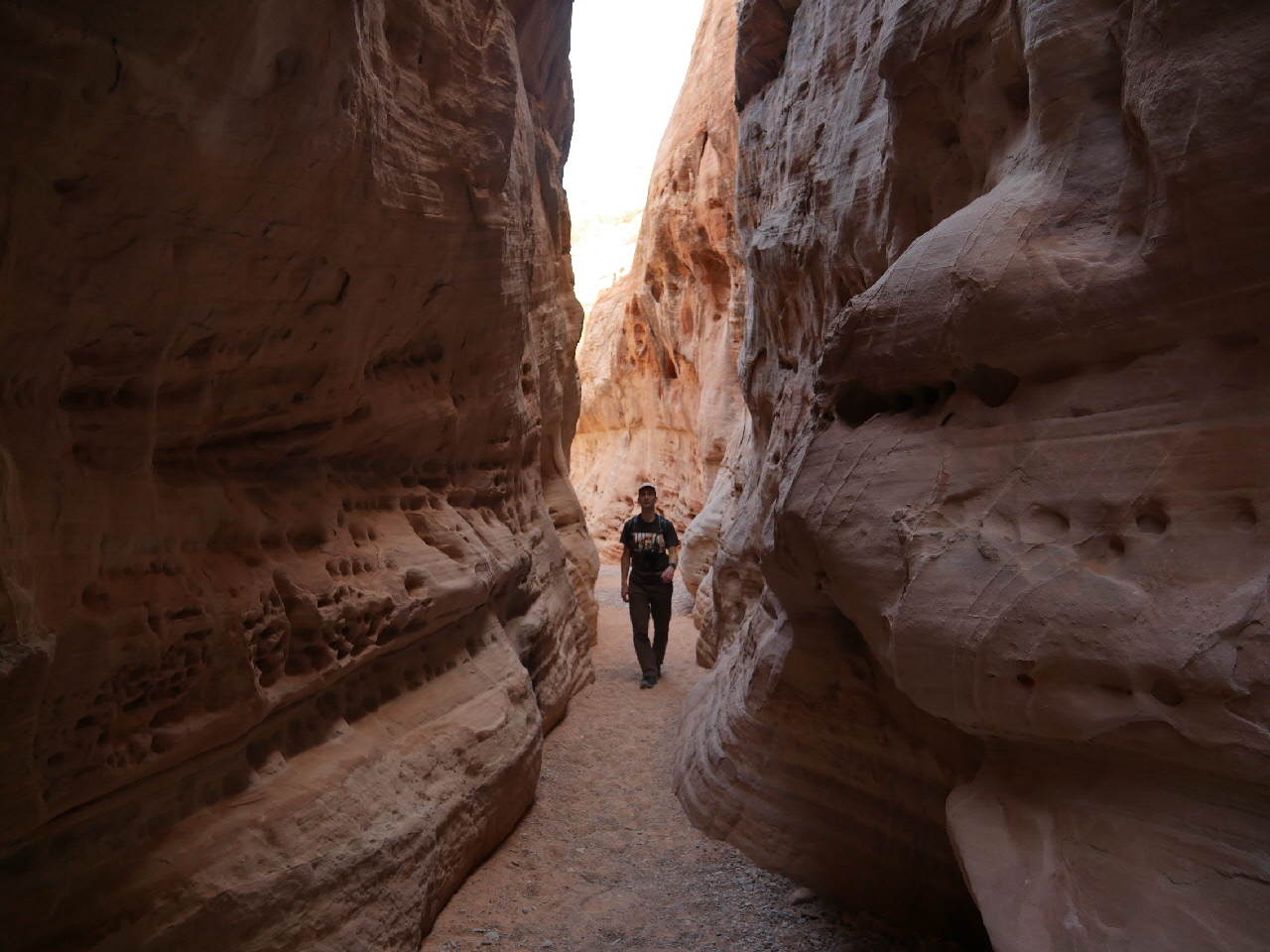 • Der Rückweg ist dann relativ unspektakulär. Nur eine kurze Fahrt mit dem Auto führt uns zum nächsten Ausgangspunkt, der Wanderung zum Crazy Hill und den White Domes. Den Abzweig zum Crazy Hill verpassen wir aber leider und suchen auch später nicht mehr ewig danach, sodass uns dieser verborgen bleibt. Wir laufen durch einen sehr schmalen, tollen Canyon, unterhalten uns, blödeln und machen unzählige Fotos. Neben den gewaltigen Formen der Felsen können diese auch durch tolle Farben und Farbunterschiede beeindrucken. Nach nicht einmal 2 Kilometern, für die wir mit allerlei Foto- und sonstigen Pausen trotzdem immerhin 40 Minuten unterwegs waren, haben wir den Rundweg hinter uns und sind zurück am Auto.