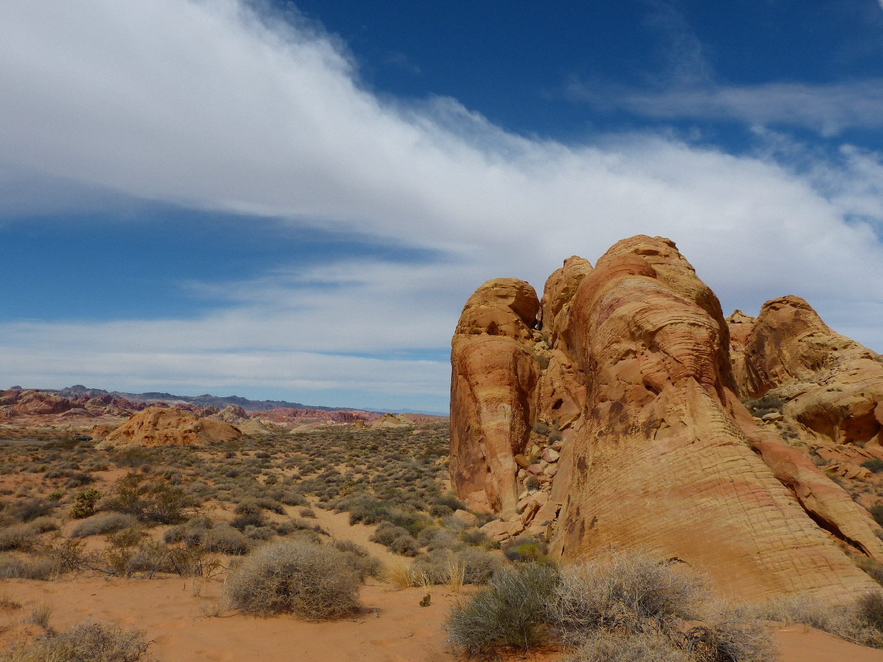 Nach dem guten und reichlichen Frühstück heißt es Sachen packen und auf in die Natur – wir verlassen Las Vegas und werden erst am vorletzten Tag unseres Urlaubs wieder zurück kommen. Vorher steht auch sonst keine größere Stadt mehr auf dem Plan. Etwa halb zehn starten wir in Richtung Nordosten mit dem Ziel Valley of Fire. Nach etwa einer Stunde erreichen wir den Parkeingang zum Valley of Fire. Hier zahlen wir die Gebühr von $10 Eintritt und legen eine kurze Pause ein, um uns auf der Karte einen ersten Überblick zu verschaffen. Anschließend fahren wir weiter zum Fire Wave Trailhead, dem Startpunkt unserer ersten diesjährigen Wanderung. Schon die Anfahrt ist wirklich beeindruckend schön. Wir sind zum ersten Mal im Valley of Fire.