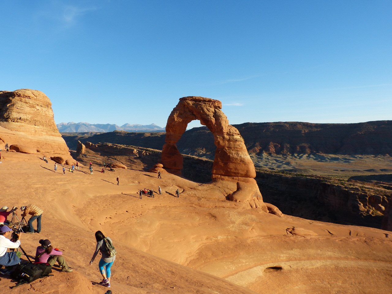 Die Wanderung ist jedenfalls wieder schön, wir haben auch genug Zeit. Am Delicate Arch angekommen dürfen zunächst die obligatorischen Fotos unter dem Steinbogen nicht fehlen ... zum Glück sind wir problemlos pünktlich. Einige Zeit später, etwa ab 20 Minuten vor Sonnenuntergang, werden andere Touristen dann zu unserer Überraschung gnadenlos ausgepfiffen, als sie versuchen, sich ebenfalls noch unter den Arch zu stellen. Ansonsten halten sich aber eigentlich alle daran, ab dieser Zeit den Arch für alle freizuhalten.