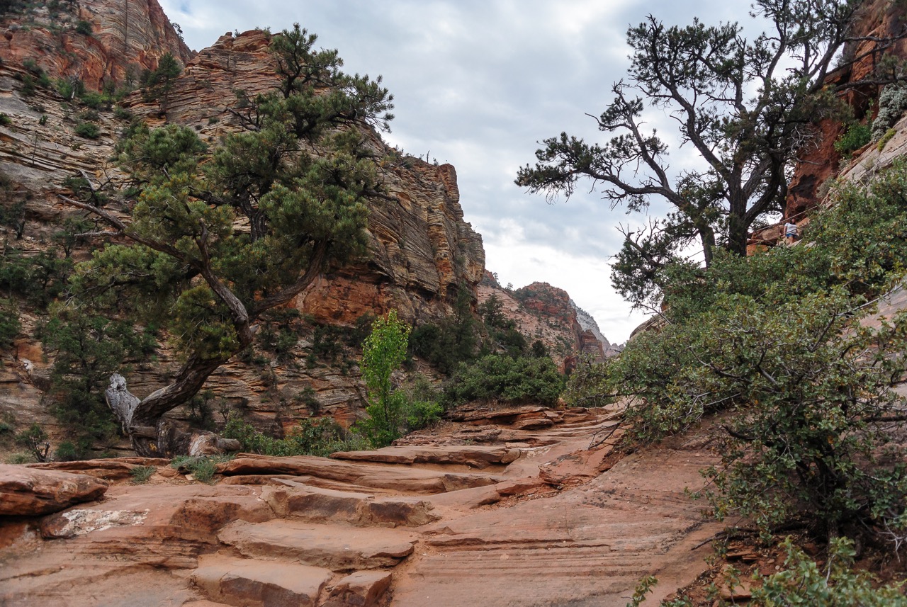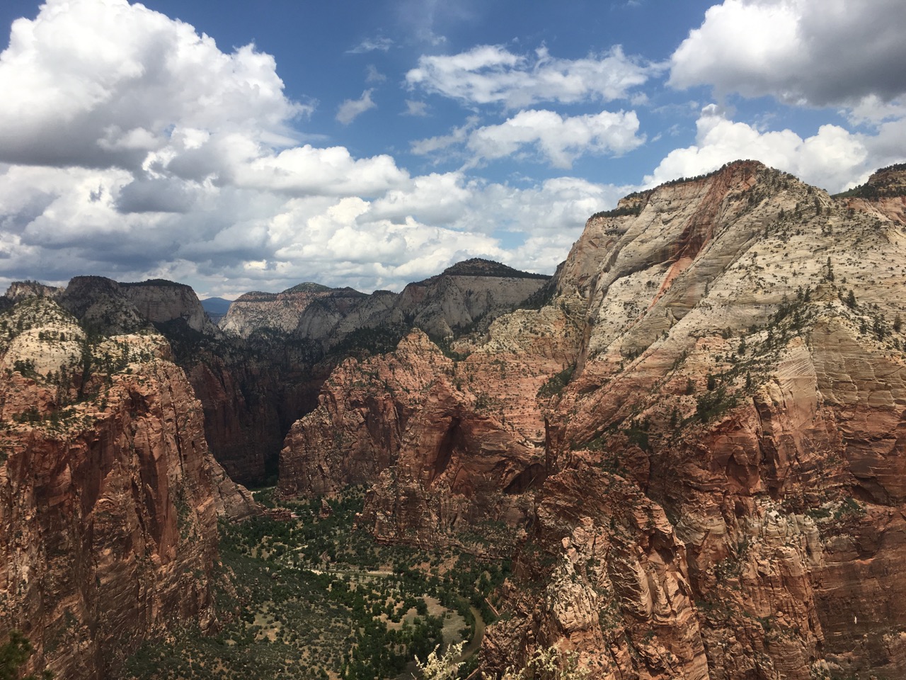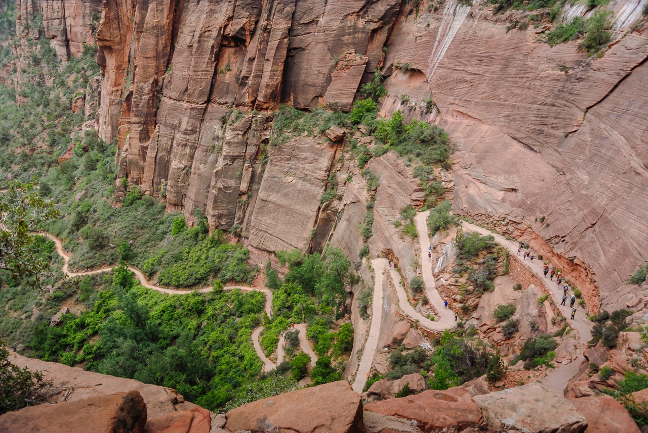 Nachdem wir unsere Sachen fertig gepackt haben ging es weiter mit dem Auto Richtung Zion Nationalpark. Es war schon gut was los, der erste Parkplatz war geschlossen aber wir fanden kurz danach ein Plätzchen am Straßenrand. Perfekt! Dann auf zum Shuttelbus rein in den Park. Dank der vielen positiven Berichte haben wir uns entschieden, Angels Landing in Angriff zu nehmen. Ich muss hier noch erwähnen, dass wir beide überhaupt nicht sportlich sind, unter dem Jahr überhaupt keine Wanderungen unternehmen und einen langweiligen Bürojob mit viel sitzen und wenig Bewegung haben. Also beste Voraussetzungen, diesen Berg zu besteigen, aber, wenn ich mir was in den Kopf gesetzt habe, dann muss es auch durchgezogen werden. Wir haben uns vor dem Urlaub schließlich gute Wanderschuhe gekauft, also ist das auch alles halb so wild. Der Anfang ging auch noch recht gut, aber irgendwann wurde es immer steiler und anstrengender. Aber hey, Zähne zusammenbeißen und weiter. So liefen wir Stück für Stück immer weiter nach oben. Ok, vielleicht habe ich auch zwei kleine Verschnaufpausen eingelegt, getarnt mit meinem Fotoapparat in der Hand, damit es den anderen Wanderern nicht auffällt, wie außer Puste ich bin ;) Irgendwann waren wir dann oben – dachte ich zumindest. Wir machten Pause, aßen ein paar Erdnüsse und beobachteten die kleinen Squirrel rumspringen. Und dann sollte es mit dem richtigen Angels Landing losgehen, dem Aufstieg entlang der Ketten. Was soll ich sagen, dass hat richtig viel Spaß gemacht und ich war auf einmal voller Energie. Ob es an den Erdnüssen lag? So kletterten wir Stein um Stein entlang der Ketten bis wir endlich am Ziel waren. Was für eine tolle Aussicht! Wir verbrachten bestimmt eine halbe Stunde hier, glücklich und stolz, dass wir es hier hingeschafft haben. Zusätzlich wurden wir mit einer tollen Aussicht belohnt. Irgendwann ging es dann wieder zurück. Den Rückweg fang ich nicht so leicht, ich hatte irgendwie immer ein bisschen Angst abzustürzen und hab viel mehr auf meine Schritte und die plötzlichen Menschenmaße in Gegenrichtung geachtet.