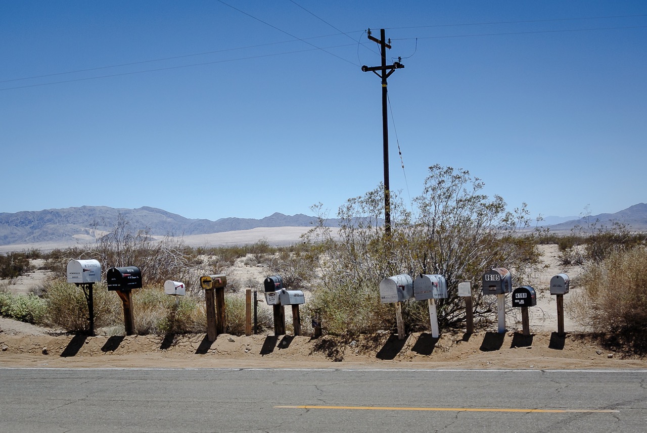 Weiter mit dem Auto entlang der Route 66. Leider war ein Teilstück gesperrt, so, dass wir uns einen anderen Weg suchen mussten. Ich weiß nicht mehr genau, wie und was wir gefahren sind, aber zumindest haben wir uns immer in die richtige Richtung weiterbewegt. Irgendwann haben wir auch wieder den Weg zurück auf die Route 66 gefunden, der wir weiter folgten. Kurzer Stopp in Amroy um ein Foto mit dem Route 66-Logo auf der Straße zu machen. Genau in diesem Moment kam eine Gruppe Motoradfahrer auf ihren Harley vorbei und winkten uns nett zu. Cool! Da es hier aber sonst nichts zu sehen gab, fuhren wir weiter bis zum Joshua Tree Nationalpark.