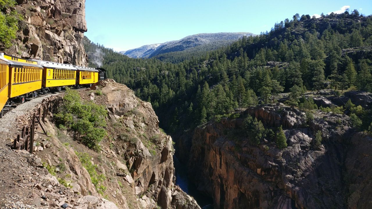 Aber auch die Sorge zu frieren erwies sich als unbegründet. der Zug (der erste des Tages um 8 Uhr) war nicht ausgebucht, wir durften im geheizten Wagen Platz nehmen und hatten eine tolle Fahr hoch nach Silverton. Allmählich verwandelte sich die Natur in eine Winterlandschaft und immer wieder boten sich tolle Blicke auf die historische Bahn, den Wildbach und die Berge. Es war keine Minute langweilig. Und jetzt kommen wir zu besten Chai-Latte überhaupt :thumbup: . Am Bahnhof als Chai-Latte für 3 $ und im Bordrestaurant als Spicy-Tea für 2,50 $ bekommt man einen herrlichen Gewürz-Milchtee, der seinesgleichen sucht. Genau das richtige bei diesen Temperaturen. Silverton ist eine ehemalige Silberminenstadt auf 2700 Meter Seehöhe und besteht überwiegend aus restaurierten und falschen Fassaden im Wildwest-Look, die auf das Publikum der Züge (3 pro Tag) mit Restaurants und Souveniershops abzielt. Dennoch war es kurzweilig und nett anzusehen.