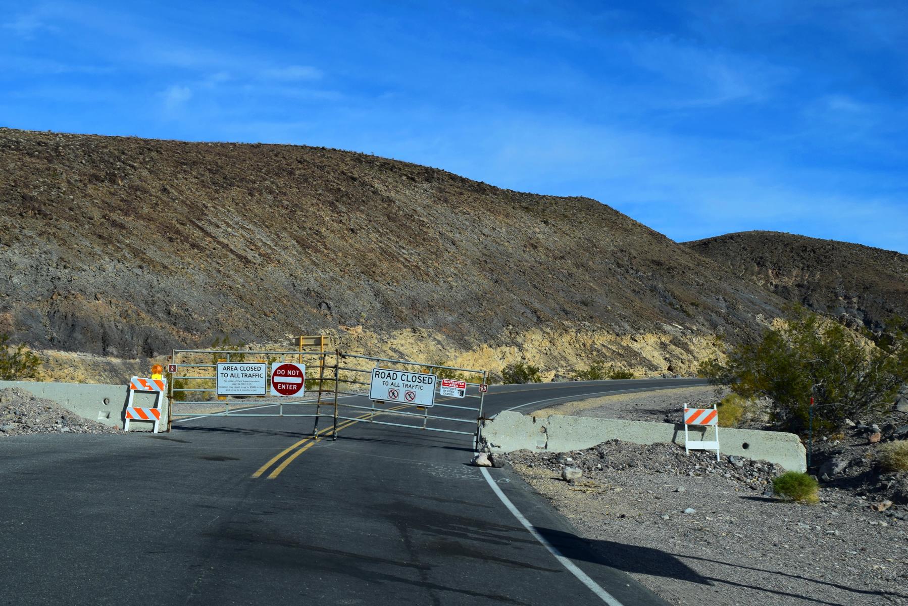 Direkt hinter dem winzigen Ort, der eigentlich nur aus Visitor Center und (geschlossenem) Campground besteht, würde es nun geradeaus zu Scotty's Castle gehen. Aufgrund von extremen Flash Flood Schäden von vor ein paar Jahren ist die Straße aber weiterhin gesperrt und soll es auch aktuell bis 2020 noch bleiben.