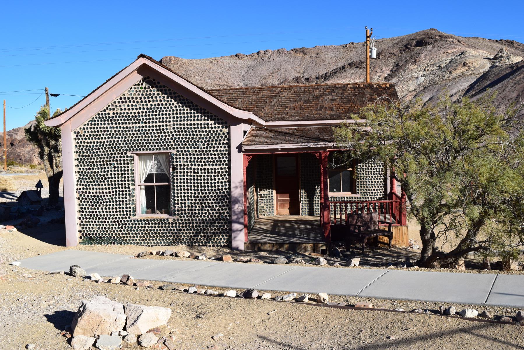 Es gibt mehr als nur einen Parkplatz für Rhyolite, da die übrig gebliebenen Gebäude ein bisschen verstreut sind. Ich halte mich zuerst an die Ausschilderung für das berühmte Bottle House, einem Haus, das komplett aus leeren Glasflaschen gebaut ist. Beim Aussteigen friere ich direkt und zieh mir den Pullover über, die paar Höhenmeter mehr merkt man hier sehr gut und außerdem weht ein sehr frischer Wind.