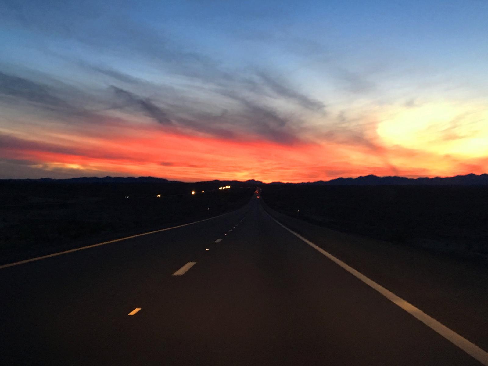 Bei St. George fahre ich auf die I15 und habe eine ereignislose Fahrt bis nach Las Vegas vor mir. Schon kurz nach Beginn der Strecke verlasse ich Utah für diese Reise und mit dem Passieren der Grenze von Arizona nach Nevada bekomme ich meine verlorene Stunde zurück. Der Sonnenuntergang währenddessen kann sich wirklich sehen lassen.