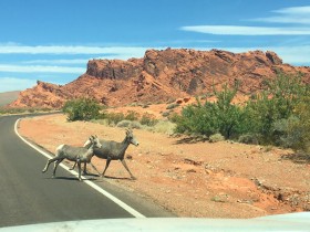 Die Osteinfahrt vom Valley of Fire ist zum ersten Mal besetzt, ich kenne hier an der Stelle bisher nur Selfpay. Kurz vor dem Visitor Center bin ich gezwungen erneut anzuhalten, aber diesen Grund lasse ich mir doch sehr gerne gefallen: Eine Herde Desert Big Horn Sheep trottet gemütlich über die Straße und das auch noch mit Nachwuchs, wie cool ist das denn bitte?