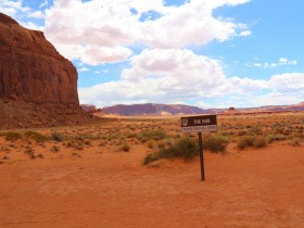 Wie so gut wie überall im Monument Valley gilt auch hier: Wandern verboten! Der einzige Trail, der ohne Navajo Guide erlaubt ist, ist der Wildcat Trail, der am Visitor Center losgeht und einmal um die West Mitten Butte führt.