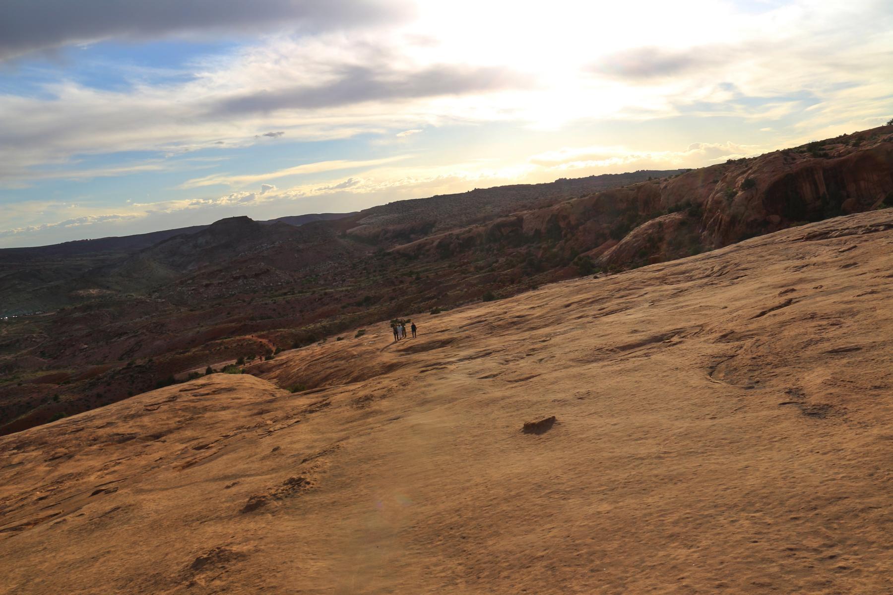 Auch hier ist es wieder komplett anders als damals: Es ist leer! Normalerweise ist am Double O Arch mehr los, denn hier kommt man noch über den "normalen" Trail hin und es ist zugegebenermaßen ja auch ein sehr eindrucksvoller Arch! Aufgrund des Himmels haben sich die meisten Leute aber offensichtlich schon zurückgezogen und auch wir planen nicht, uns hier länger aufzuhalten. Ich glaube, wir sollten ganz schnell gucken, das wir hier weg kommen. Wir begeben uns wieder auf den Main Trail, der direkt hinter dem Arch etwas grenzwertig für Leute mit Höhenangst ist.