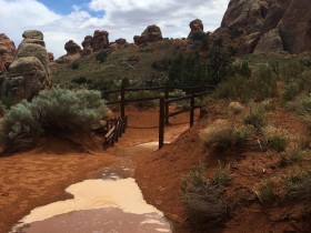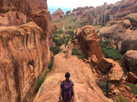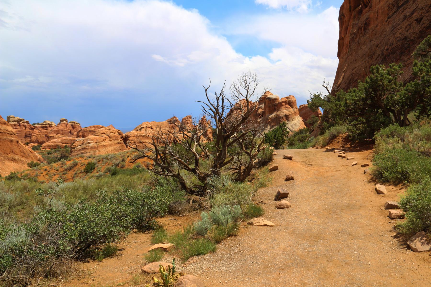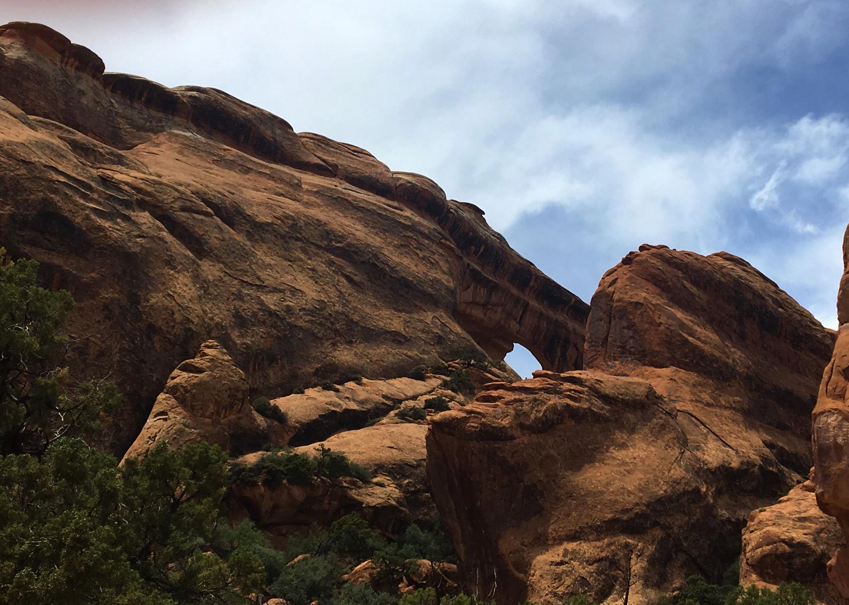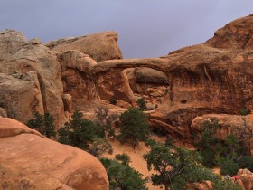 Auch hier ist es wieder komplett anders als damals: Es ist leer! Normalerweise ist am Double O Arch mehr los, denn hier kommt man noch über den "normalen" Trail hin und es ist zugegebenermaßen ja auch ein sehr eindrucksvoller Arch! Aufgrund des Himmels haben sich die meisten Leute aber offensichtlich schon zurückgezogen und auch wir planen nicht, uns hier länger aufzuhalten. Ich glaube, wir sollten ganz schnell gucken, das wir hier weg kommen. Wir begeben uns wieder auf den Main Trail, der direkt hinter dem Arch etwas grenzwertig für Leute mit Höhenangst ist.