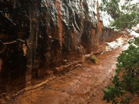 Irgendwann hört es auf und es haben sich schon einige Sturzbäche um uns herum gebildet.