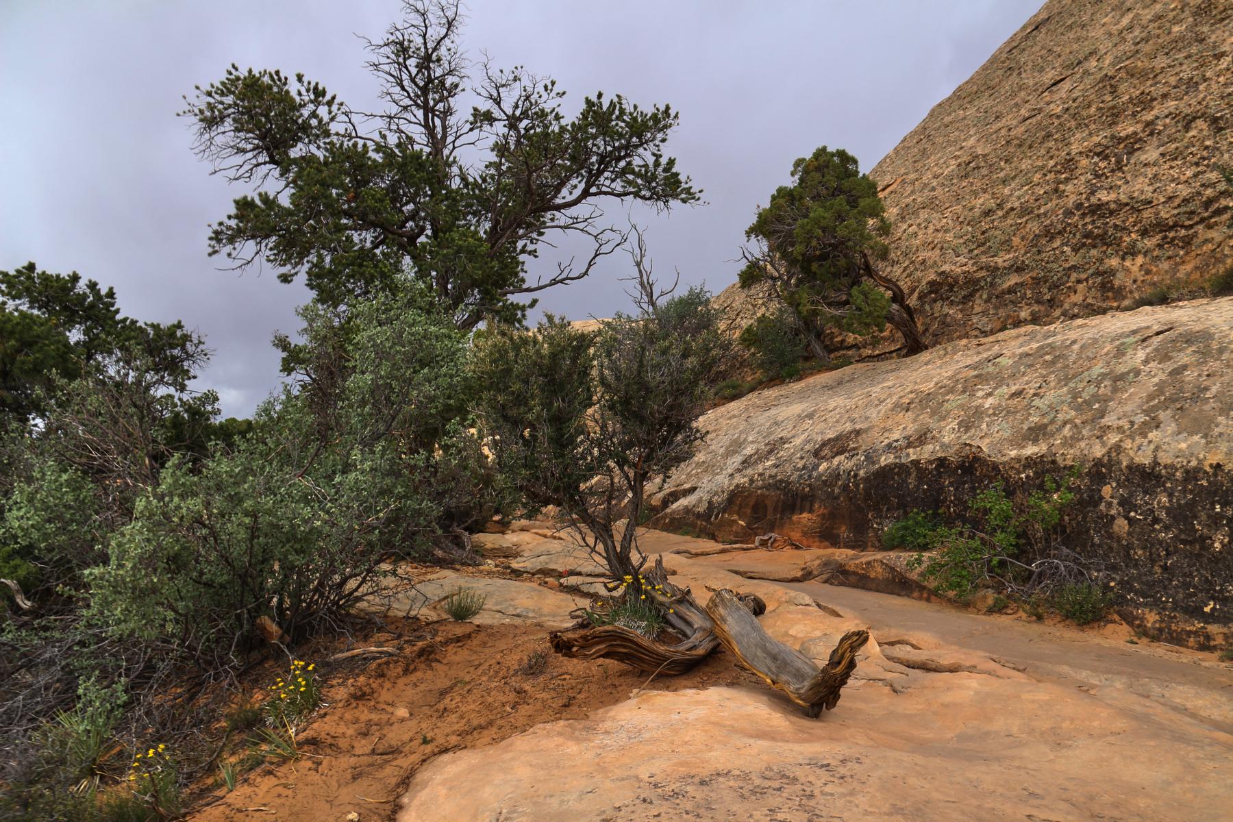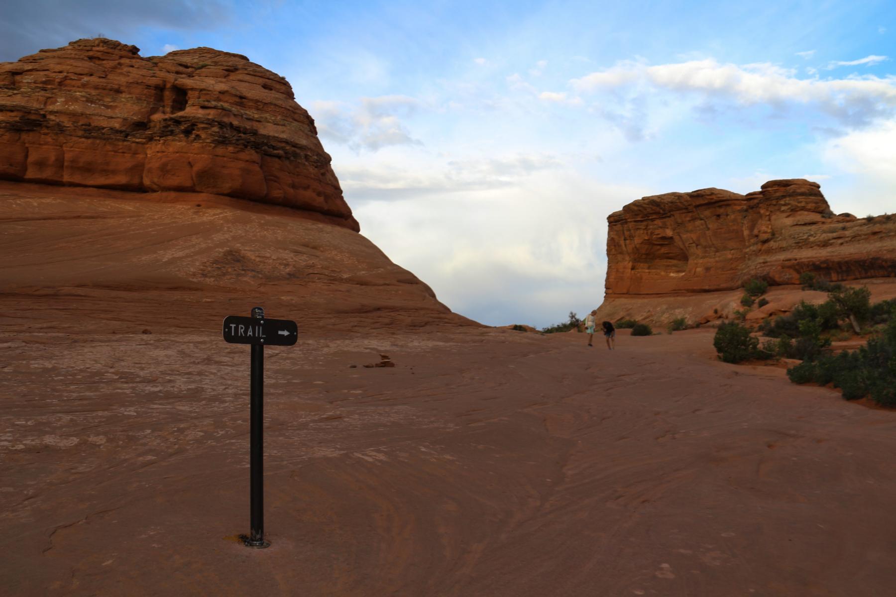 Auch hier ist es wieder komplett anders als damals: Es ist leer! Normalerweise ist am Double O Arch mehr los, denn hier kommt man noch über den "normalen" Trail hin und es ist zugegebenermaßen ja auch ein sehr eindrucksvoller Arch! Aufgrund des Himmels haben sich die meisten Leute aber offensichtlich schon zurückgezogen und auch wir planen nicht, uns hier länger aufzuhalten. Ich glaube, wir sollten ganz schnell gucken, das wir hier weg kommen. Wir begeben uns wieder auf den Main Trail, der direkt hinter dem Arch etwas grenzwertig für Leute mit Höhenangst ist.
