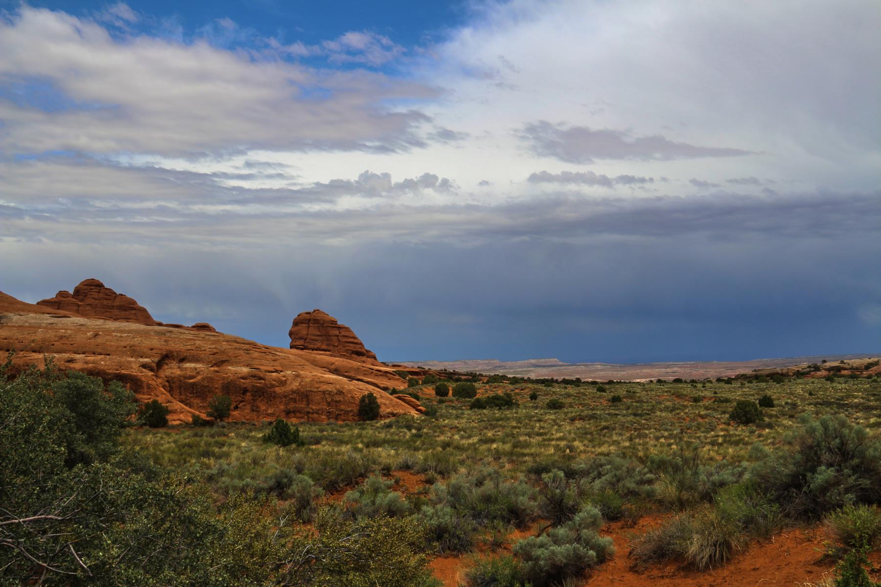 Landscape Arch von der Yellow Flat Area  Hier noch nicht loslaufen! (Der Arch ist aufgrund der Entfernung etwas schwer zu sehen. Man findet ihn am Horizont über dem rechten grünen Busch.)