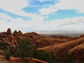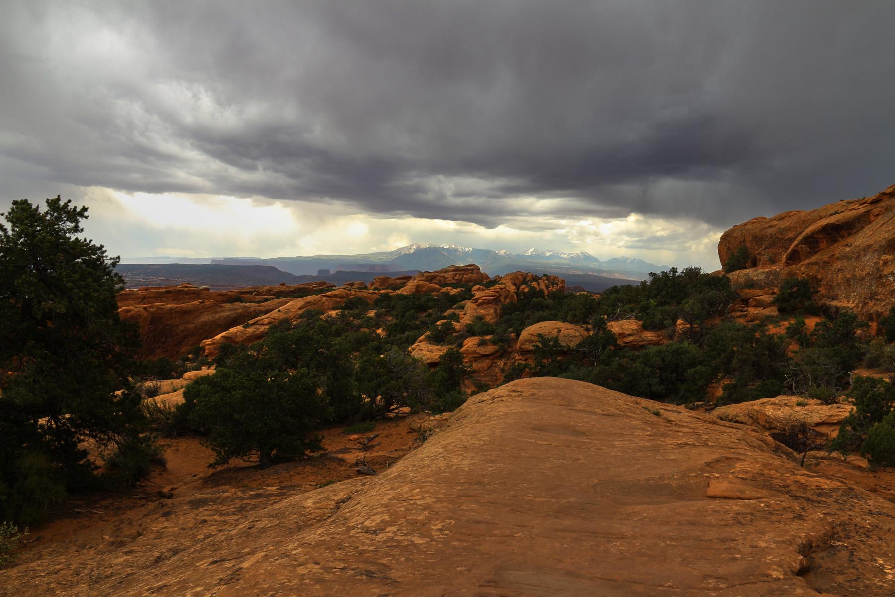 Hier oben hat man eine geniale Weitsicht auf den Arches National Park und die La Sal Mountains, die können wir aber momentan wirklich nicht genießen. Zum einen weht plötzlich ein eisiger Wind und zum anderen... WAS ZUR HÖLLE IST DA AM HIMMEL LOS?!?! Im nachhinein faszinierende Bilder, vor Ort... Uncool. Sehr uncool!
