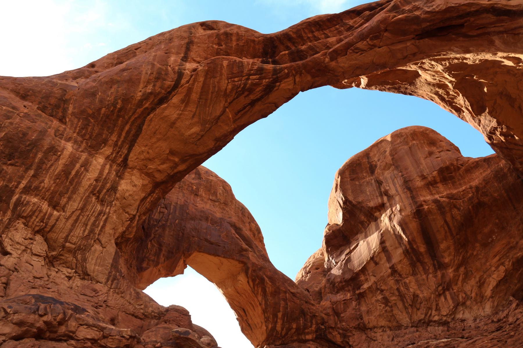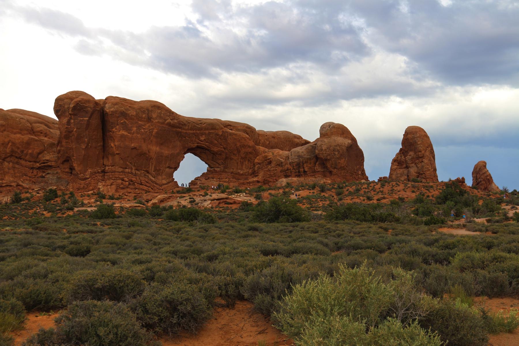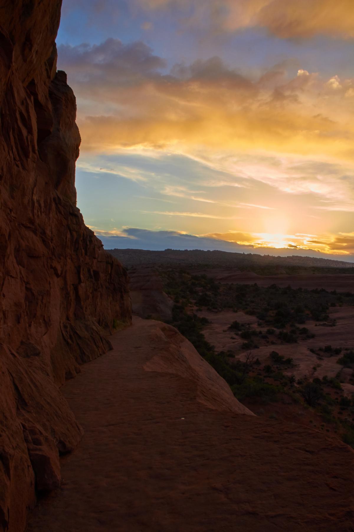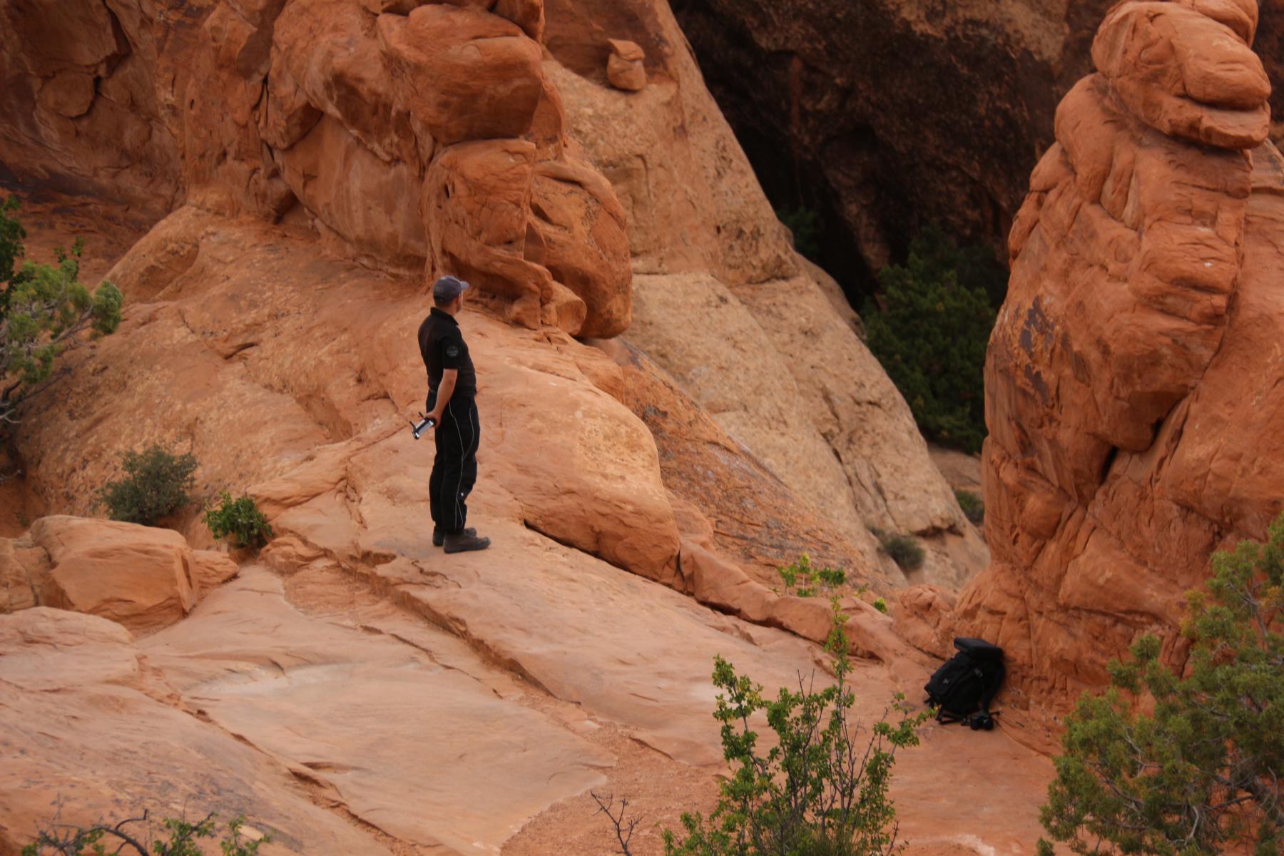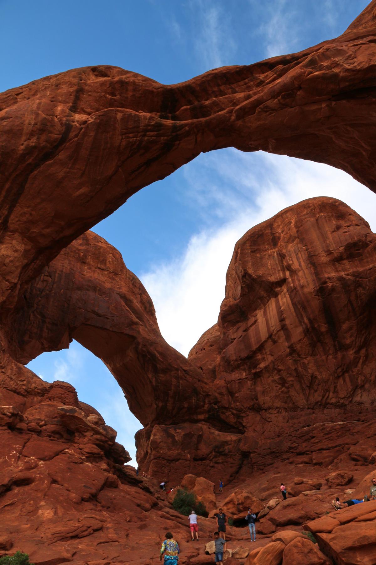 Auch hier ist es wieder komplett anders als damals: Es ist leer! Normalerweise ist am Double O Arch mehr los, denn hier kommt man noch über den "normalen" Trail hin und es ist zugegebenermaßen ja auch ein sehr eindrucksvoller Arch! Aufgrund des Himmels haben sich die meisten Leute aber offensichtlich schon zurückgezogen und auch wir planen nicht, uns hier länger aufzuhalten. Ich glaube, wir sollten ganz schnell gucken, das wir hier weg kommen. Wir begeben uns wieder auf den Main Trail, der direkt hinter dem Arch etwas grenzwertig für Leute mit Höhenangst ist.