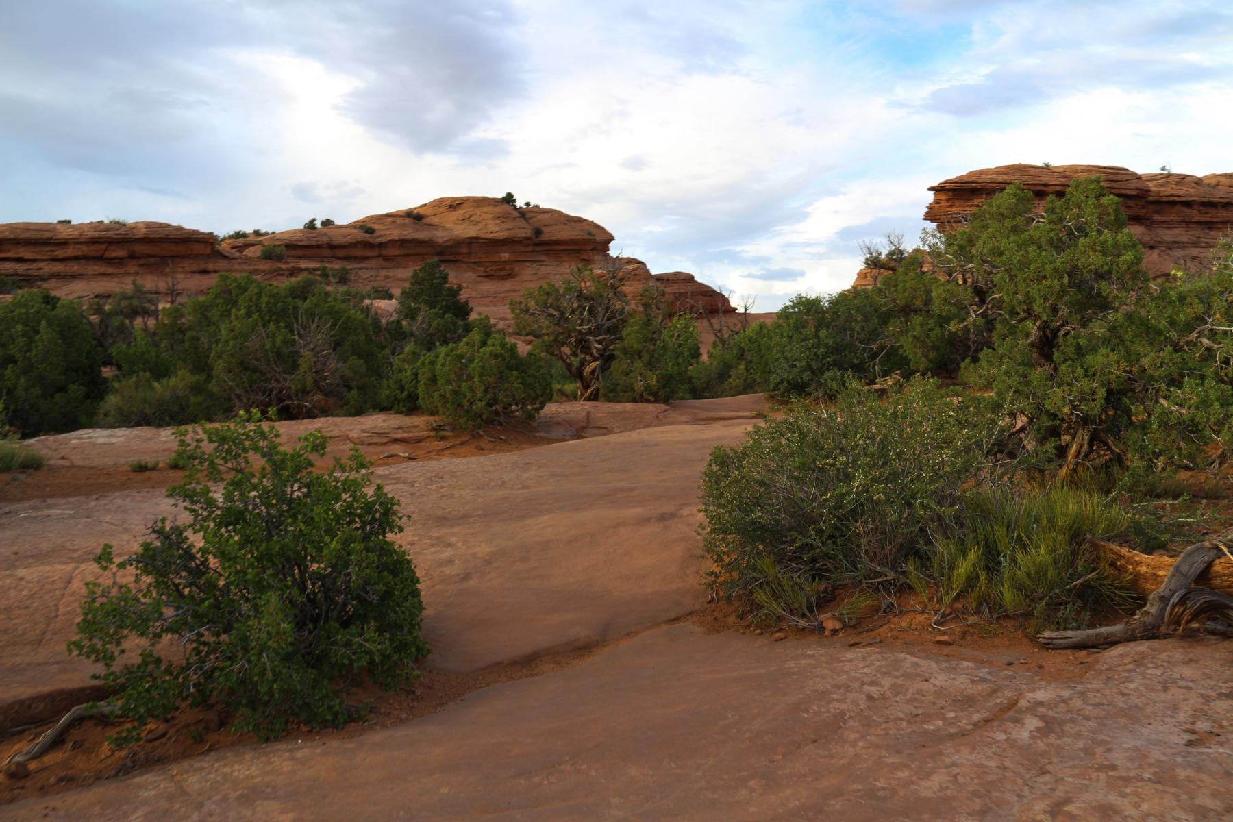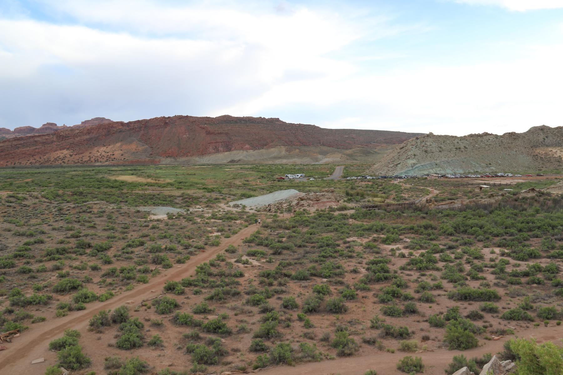 Landscape Arch von der Yellow Flat Area Hier noch nicht loslaufen! (Der Arch ist aufgrund der Entfernung etwas schwer zu sehen. Man findet ihn am Horizont über dem rechten grünen Busch.)