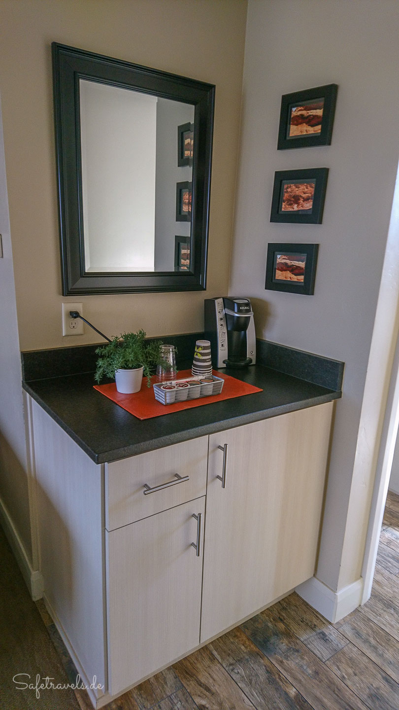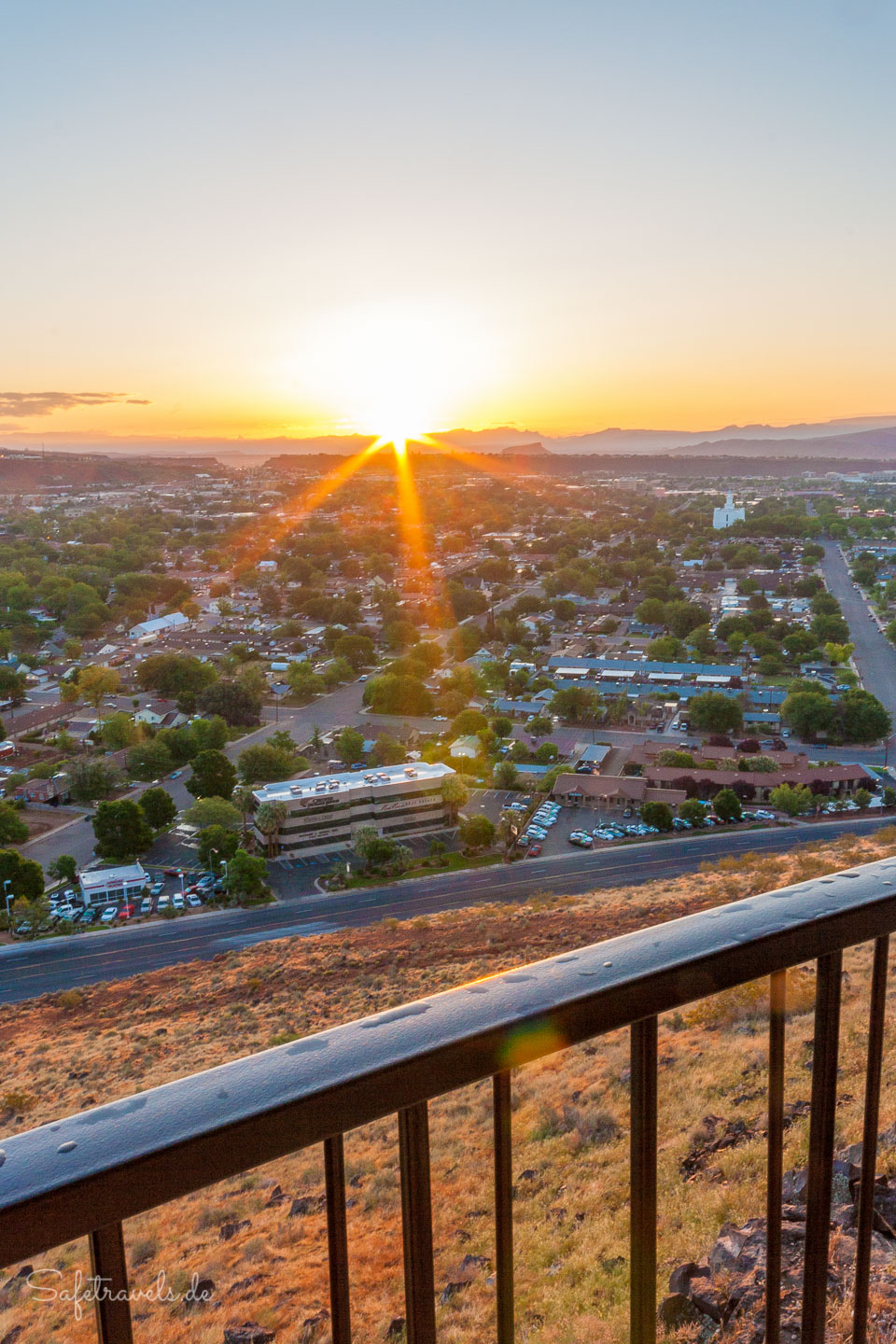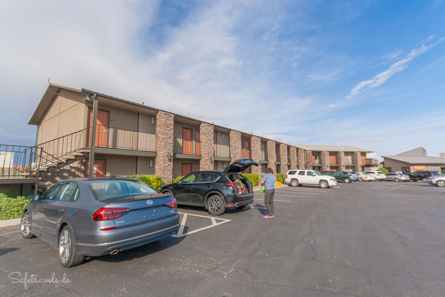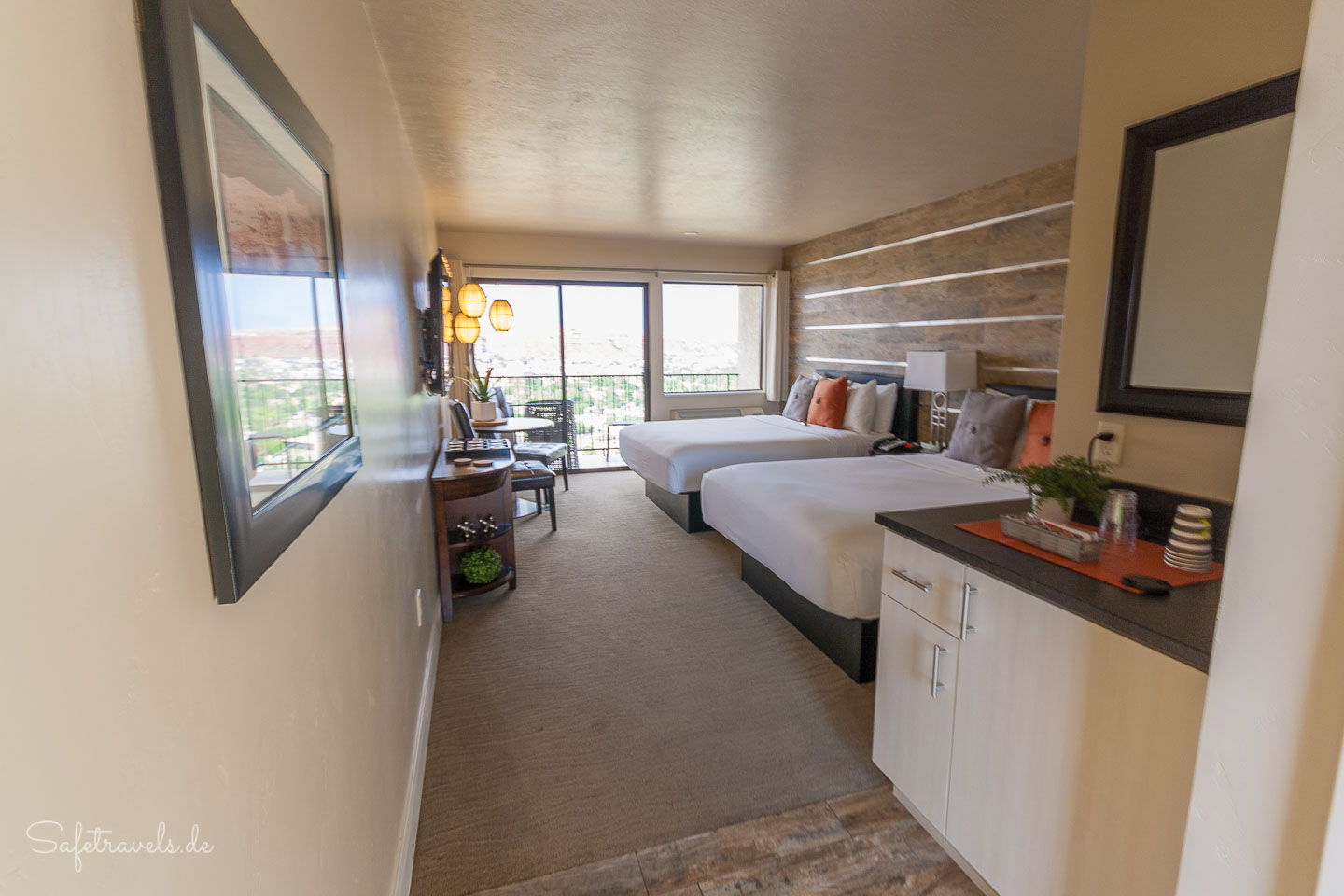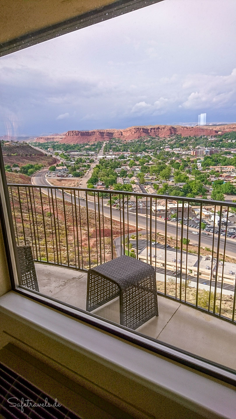Das Hotel liegt im Westen von St. George direkt an einem roten Felshang und bietet von den Balkonen, mit denen jedes Zimmer ausgestattet ist, einen grandiosen Blick auf das Zentrum von St. George. Die Balkone sind dezent möbliert und man kann gemütlich darauf sitzen. Die Zimmer sind geschmackvoll und modern eingerichtet. Das Frühstück wird morgens direkt aufs Zimmer gebracht, dazu muss man nur kurz bei der Rezeption anrufen.