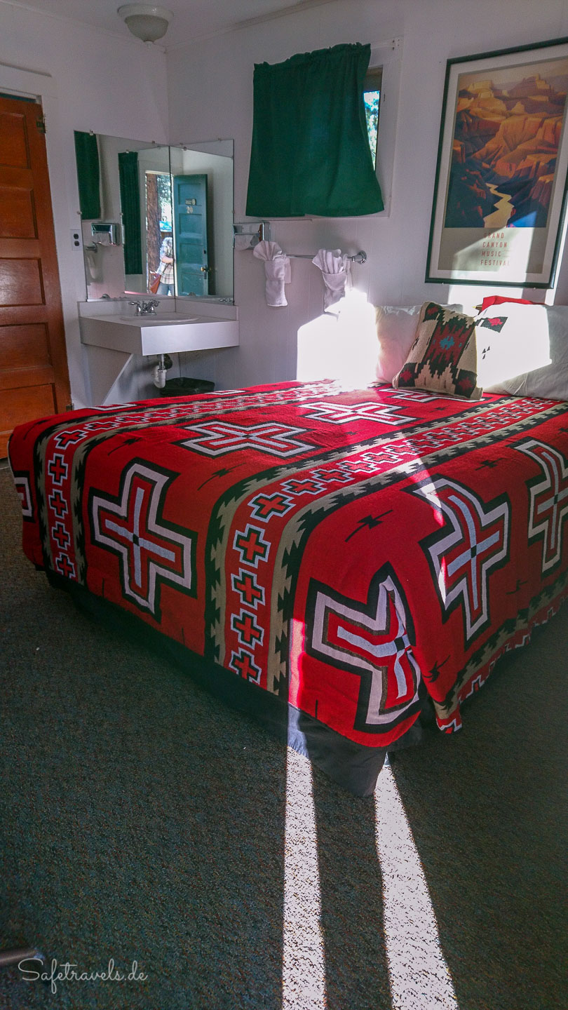 Das Jacob Lake Inn hat neben einigen Motelzimmern direkt am Hauptgebäude noch einen Block mit Hotelzimmern sowie auch im Wald verstreute Cabins. Gegenüber liegt ein Campground. Wir haben uns für eine Cabin mit 2 Queens entschieden. Jede Cabin hat ein eigenes Bad und auch eine kleine Veranda mit Stühlen. Das war natürlich unser Frühstücksplatz.