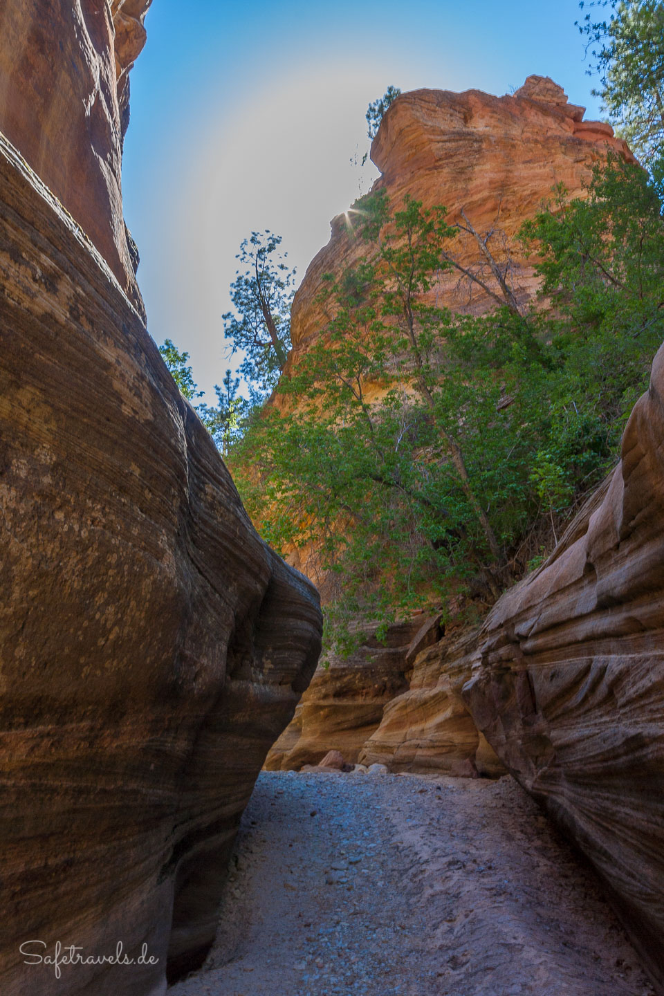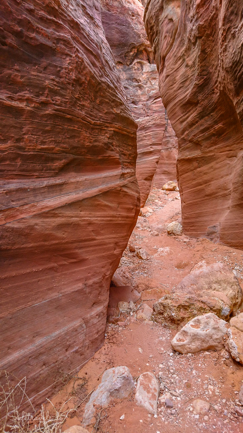 Von hier geht es Richtung Westen quer durchs Gebüsch direkt auf die Felswand zu. Das Gebüsch ist ziemlich dicht und manchmal bräuchten wir fast eine Machete. Kurz vor der Felswand überqueren wir den Cottonwood Creek und finden den Einschnitt bzw. den kleinen Seitencanyon, in dem sich der Yellow Rock Trailhead befindet.