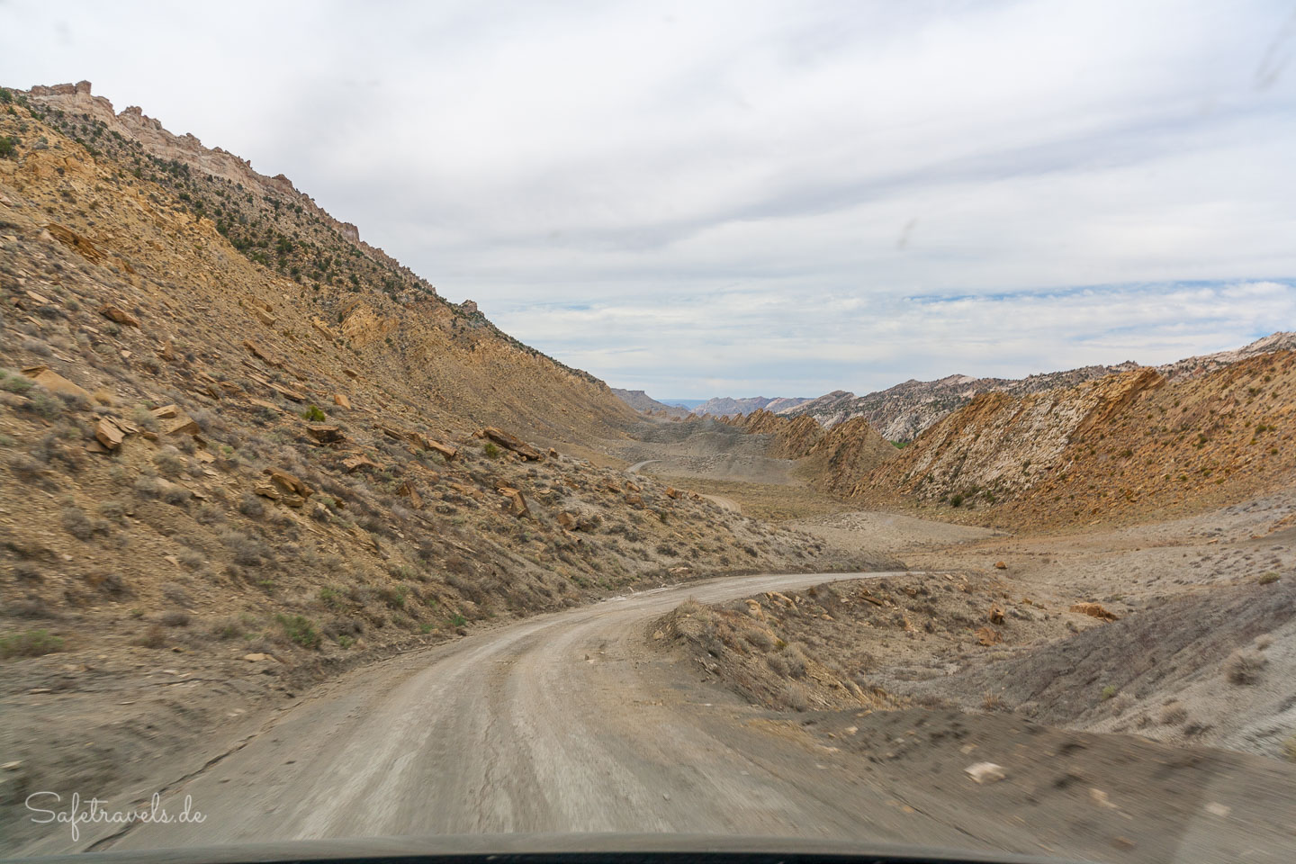 Die weitere Strecke ist abwechslungsreich und teilweise kommen wir uns vor, wie auf einem anderen Planeten. Die Straße windet sich Richtung Süden am sogenannten Cockscomb entlang, einer markanten, hahnenkammartigen Felsverwerfung.