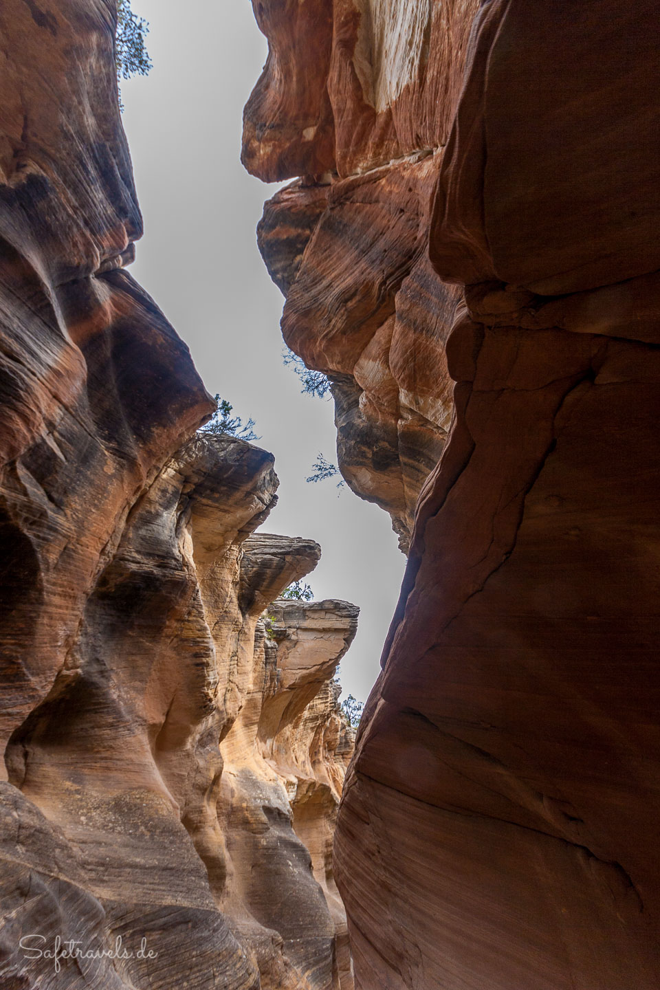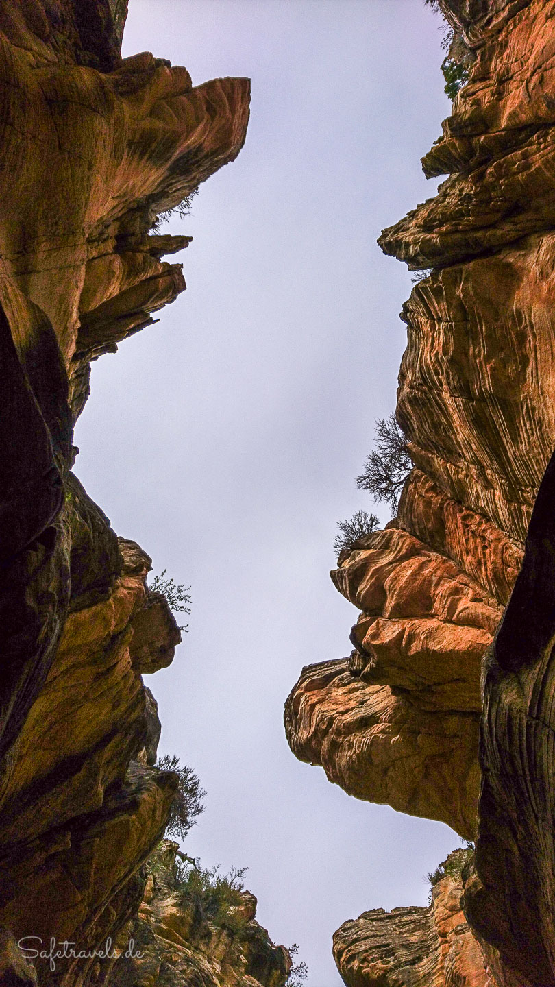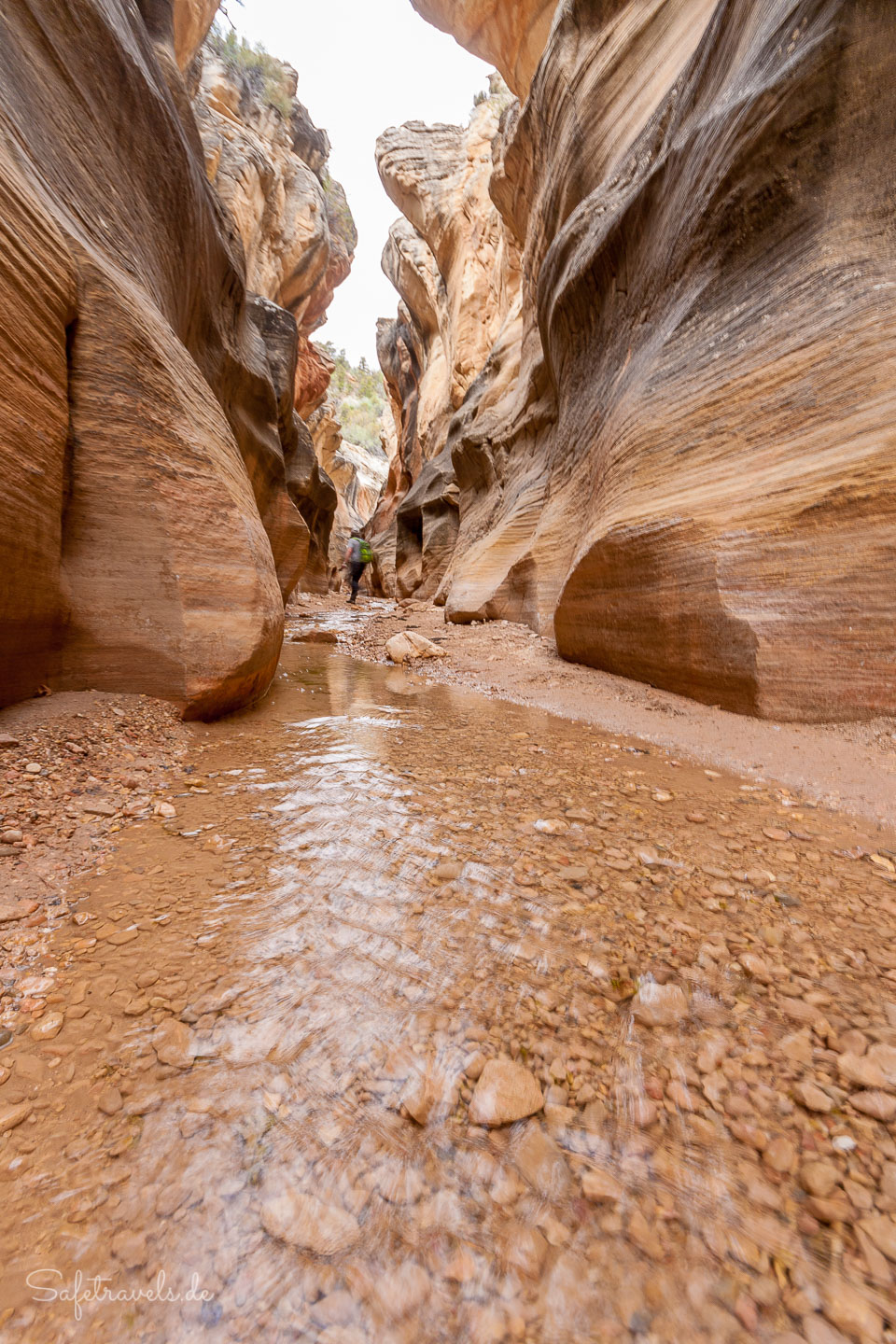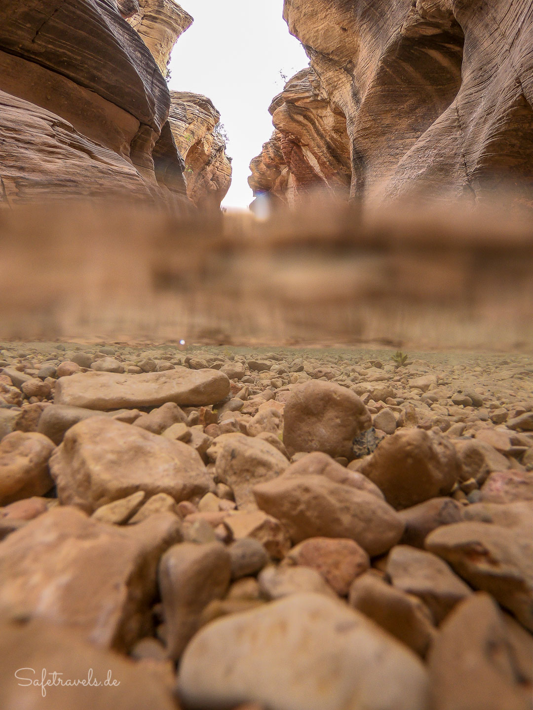 Im Slot fließt ganzjährig Wasser. Jetzt im Mai kommen wir trotzdem trockenen Fußes bis zum anderen Ende des Canyons und zurück. Wir verbringen hier etwa 40 Minuten und machen ein paar Fotos. Auch die GoPro kommt mal für ein Unterwasser-Foto zum Einsatz.
