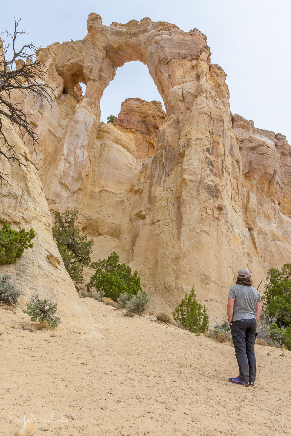 Nächster Stopp: Grosvenor Arch. Kurz hinter dem Kodachrome Basin State Park, den wir uns für einen nächsten Besuch in der Gegend aufheben, zweigt eine Dirt Road Richtung Osten ab. Nach kurzer Fahrt erreichen wir den Parkplatz zum Grosvenor Arch. Hier ist richtig viel los, u.a. sind mehrere Schulklassen vor Ort. Wir gehen den kurzen Trail zum Arch und bewundern den riesigen Bogen aus markant gelbem Stein.