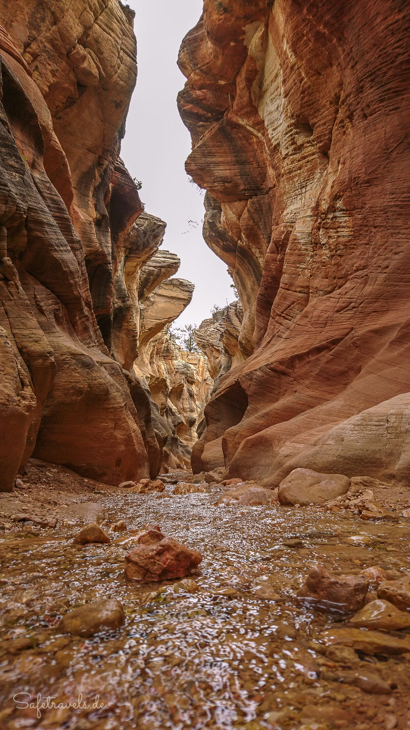 Im Slot fließt ganzjährig Wasser. Jetzt im Mai kommen wir trotzdem trockenen Fußes bis zum anderen Ende des Canyons und zurück. Wir verbringen hier etwa 40 Minuten und machen ein paar Fotos. Auch die GoPro kommt mal für ein Unterwasser-Foto zum Einsatz.