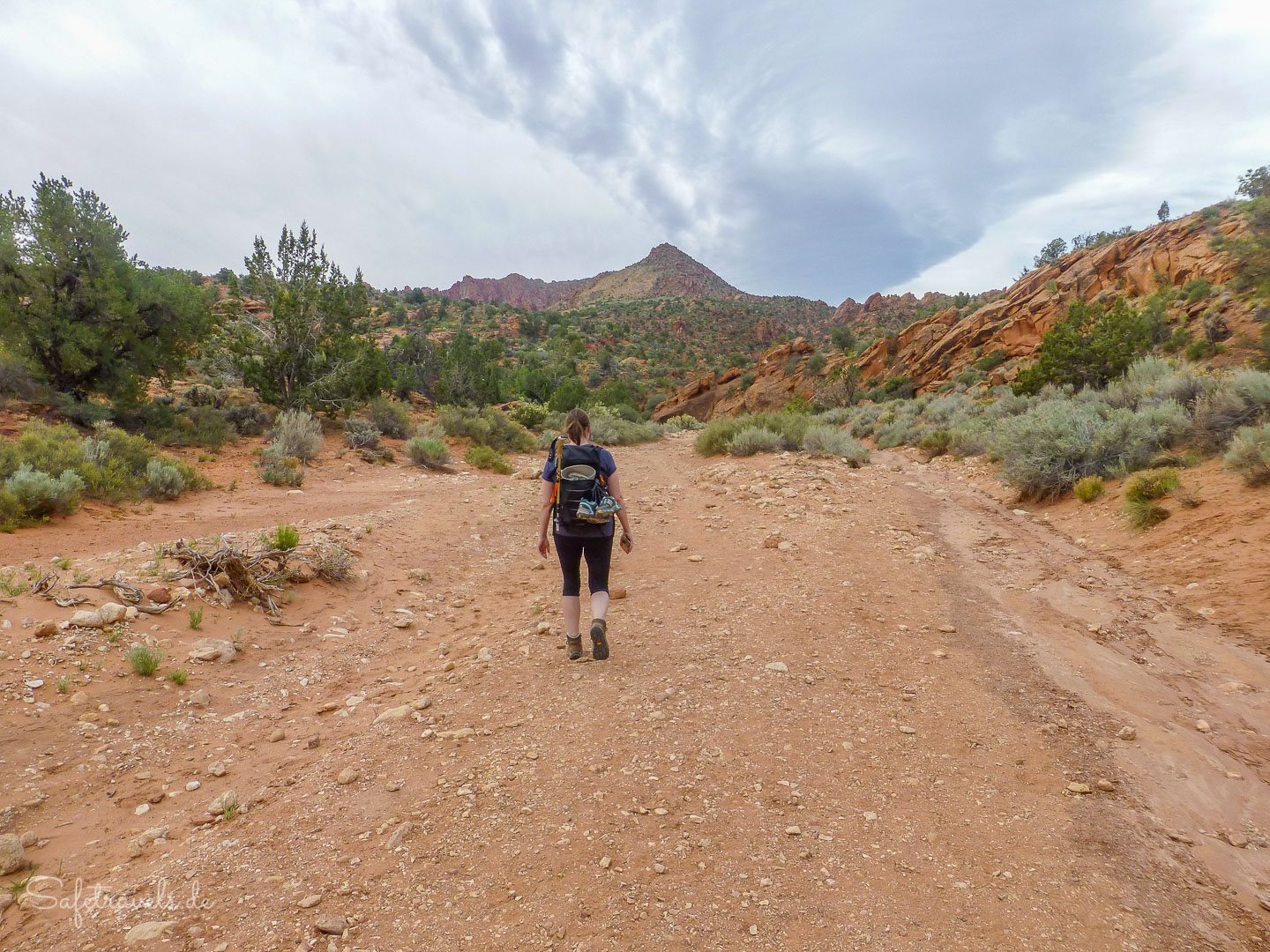 Von hier geht es Richtung Westen quer durchs Gebüsch direkt auf die Felswand zu. Das Gebüsch ist ziemlich dicht und manchmal bräuchten wir fast eine Machete. Kurz vor der Felswand überqueren wir den Cottonwood Creek und finden den Einschnitt bzw. den kleinen Seitencanyon, in dem sich der Yellow Rock Trailhead befindet.