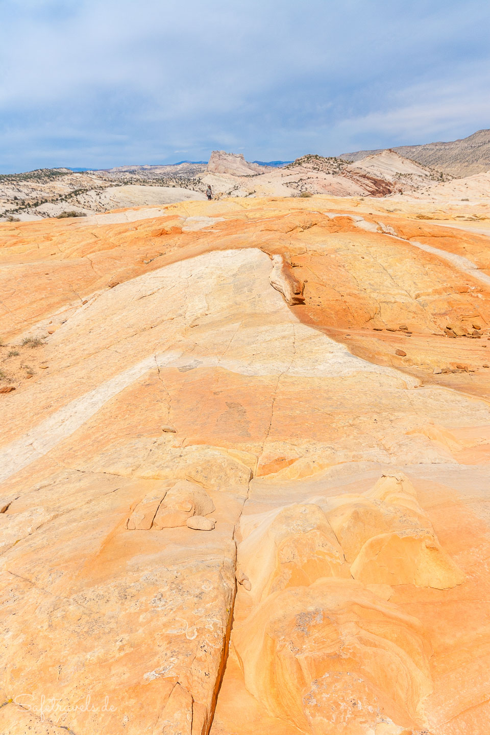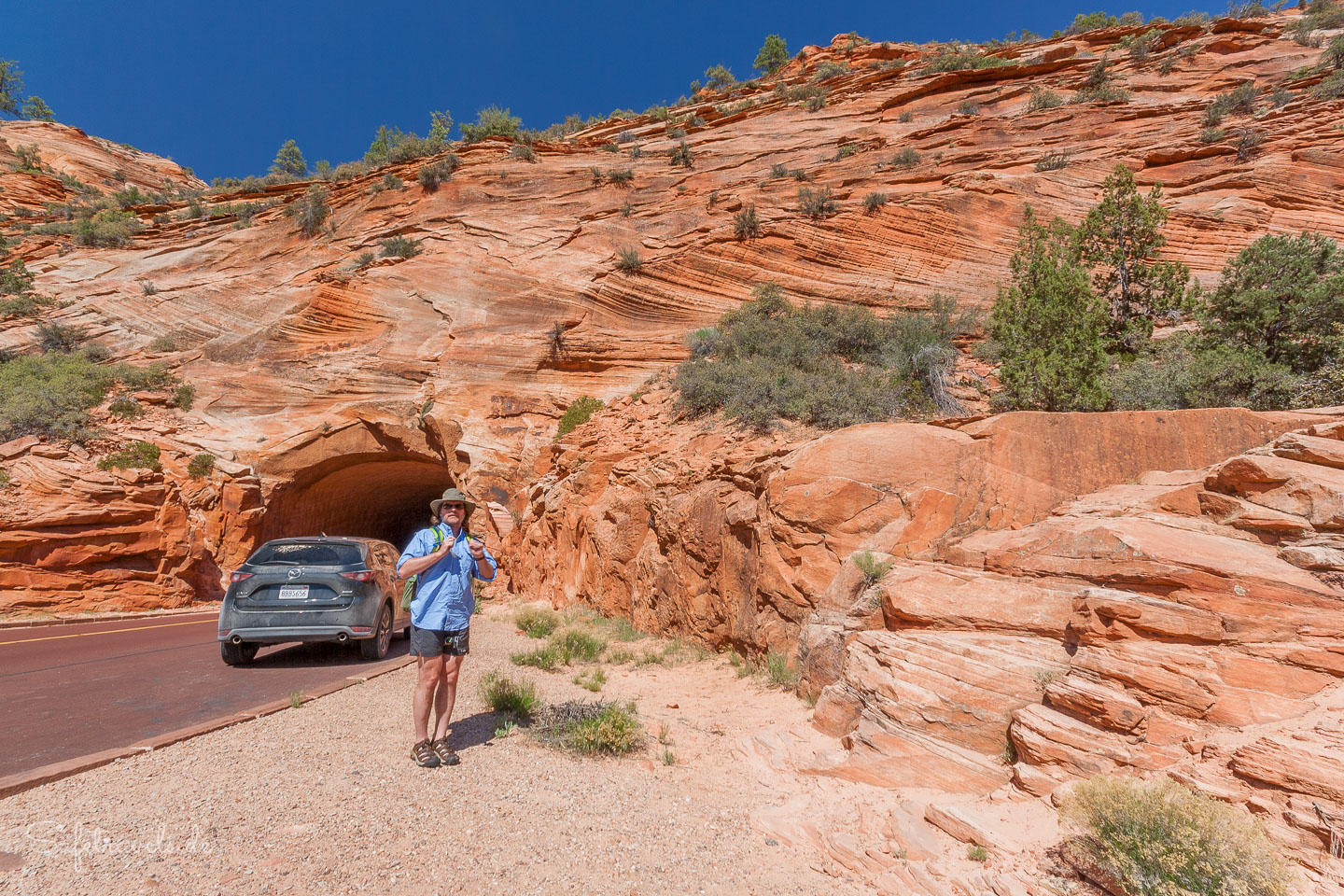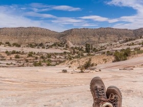 Gegen 13 Uhr passieren wir den Trailhead zum Lower Hackberry Canyon, an dem einige Autos parken. Einige Leute parken hier für den Yellow Rock, auf den wir heute auch noch klettern wollen. Wir halten uns jedoch an die Beschreibung von Peter Felix Schäfer und parken am Abzweig zur Brigham Plains Road.