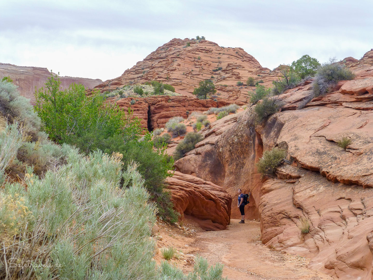 Von hier geht es Richtung Westen quer durchs Gebüsch direkt auf die Felswand zu. Das Gebüsch ist ziemlich dicht und manchmal bräuchten wir fast eine Machete. Kurz vor der Felswand überqueren wir den Cottonwood Creek und finden den Einschnitt bzw. den kleinen Seitencanyon, in dem sich der Yellow Rock Trailhead befindet.