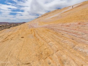 Ein paar Meter sind es noch bis zum Fuß des Berges und ich bin schon ziemlich kaputt. Wir haben uns natürlich auch die beste Zeit für diesen Hike ausgesucht: über Mittag. Als wir den gelben Sandsteinhügel erreichen, mache ich erstmal eine kurze Pause unter einem Gebüsch im Schatten, bevor wir den Anstieg auf den Gipfel wagen.