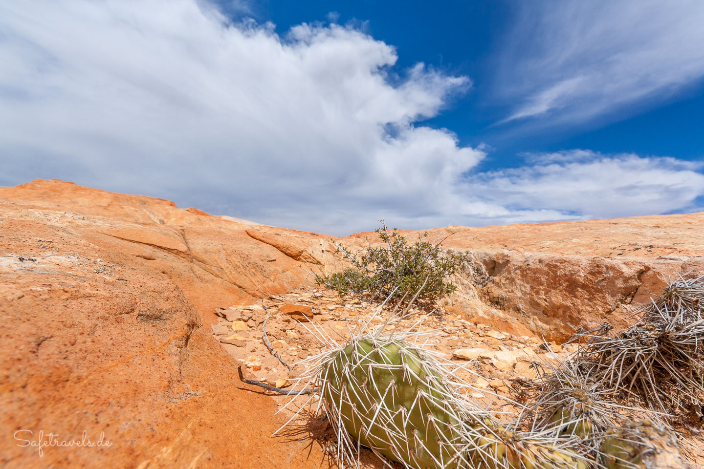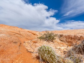 Vom Trailhead aus geht es extrem steil über ein nettes Geröllfeld mit Kakteen nach oben. Ein schmaler Pfad und einige Steinmännchen sind erkennbar und wir kämpfen uns mit brennender Lunge nach oben. Von hier ist der Yellow Rock selbst noch nicht zu sehen. Es liegen noch ein paar steile Meter vor uns, bevor der gelbe Riese ins Blickfeld kommt.