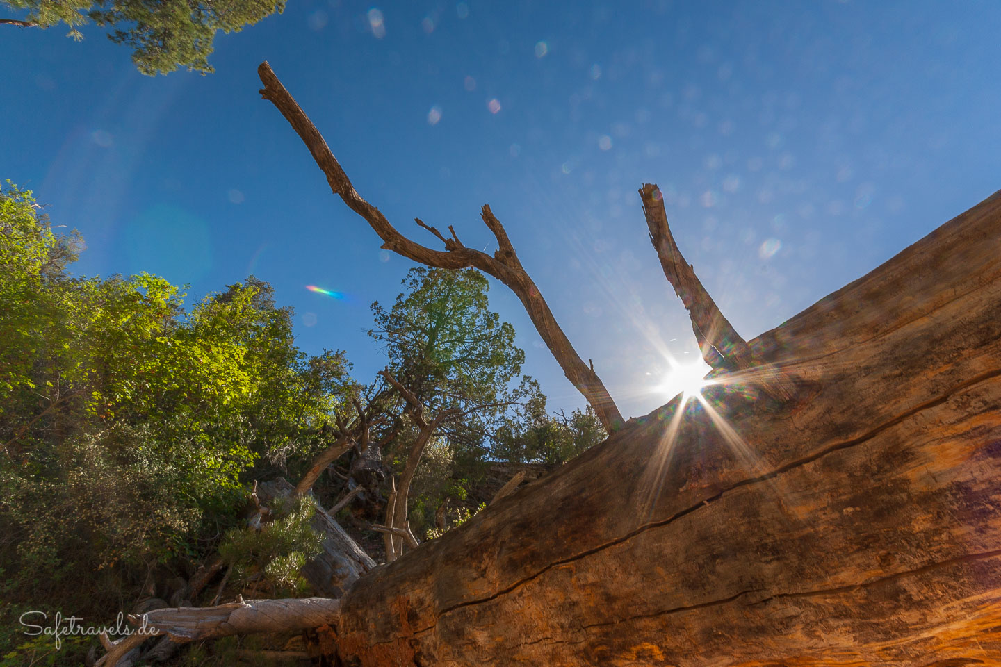 Von hier geht es Richtung Westen quer durchs Gebüsch direkt auf die Felswand zu. Das Gebüsch ist ziemlich dicht und manchmal bräuchten wir fast eine Machete. Kurz vor der Felswand überqueren wir den Cottonwood Creek und finden den Einschnitt bzw. den kleinen Seitencanyon, in dem sich der Yellow Rock Trailhead befindet.