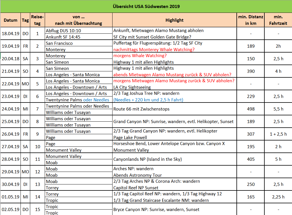Was meint ihr zu der Route? Ist das so realistisch machbar? Habt ihr vielleicht Verbesserungsvorschläge für mich? Das ist übrigens unser erstes Mal im Südwesten, aber wir wissen auch jetzt schon, dass es nicht unser letztes Mal gewesen sein wird - beim nächsten Mal dann aber vermutlich eher im September!