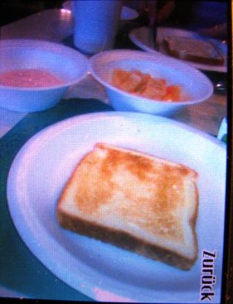 Wir wollten uns gerade aufmachen auf die suche nach dem Frühstück , da kam es auch schon um die Ecke: 1 Tost - Marmelade - Joghurt-Obst , alles in Papptellern . Ein 2. Kaffee war wohl auch nicht vorgesehen , zumindest erfolgte keine Nachfrage.