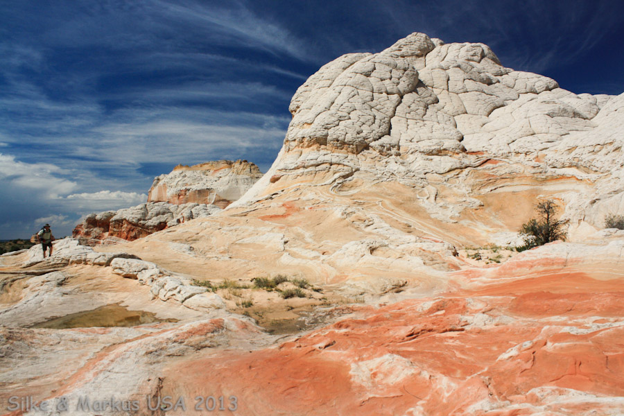 Nach der Pause geht es zurück in den Wagen und Brent überzeugt uns erneut von seinen Fahrkenntnissen. Das nächste Ziel ist White Pocket. Schon vom Parkplatz aus sind die weißen Formationen zu sehen. Die Gegend ist deutlich kleiner als die Coyote Buttes South und nicht weniger schön. Wir sehen also an diesem Tag zwei gänzlich unterschiedliche Gegenden. Hier überwiegen die Farben weiß, rot, blau und grün. Ja, tatsächlich gibt es hier überraschend viele grüne Stellen. Wir klettern in den Hügeln und den kleinen Canyons umher, bis am Himmel langsam ein Gewitter aufzieht. Inzwischen sind wir auch ziemlich müde und unsere Gehirne platzen fast bei der Fülle an Eindrücken.